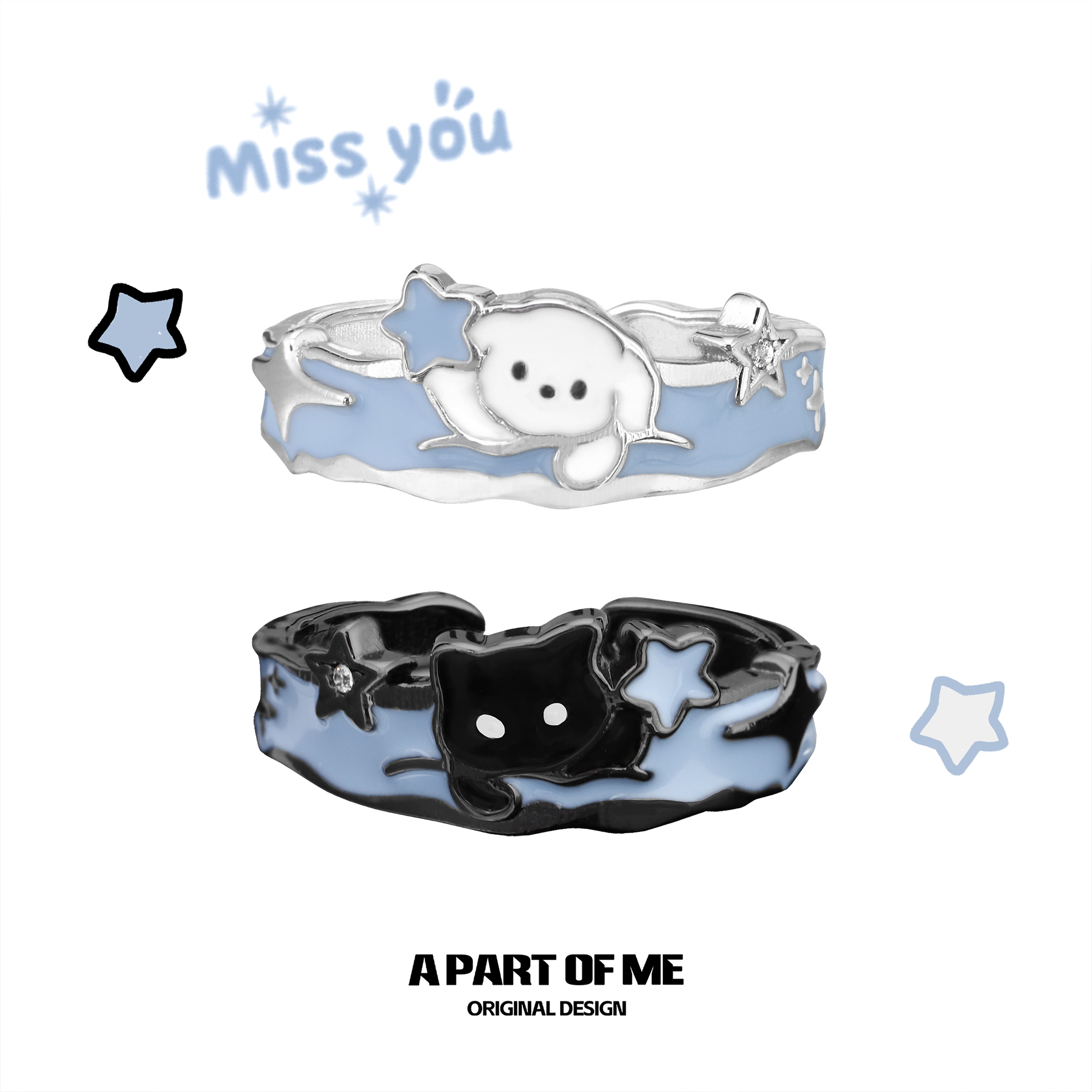 Kitten and puppy original 925 sterling silver ring couple ring in the snow