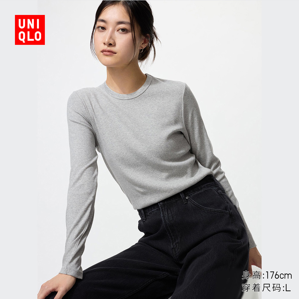 Uniqlo Women's Soft Ribbed Crew Neck T-Shirt Long Sleeve Solid Color Basic 474400 479590 470124