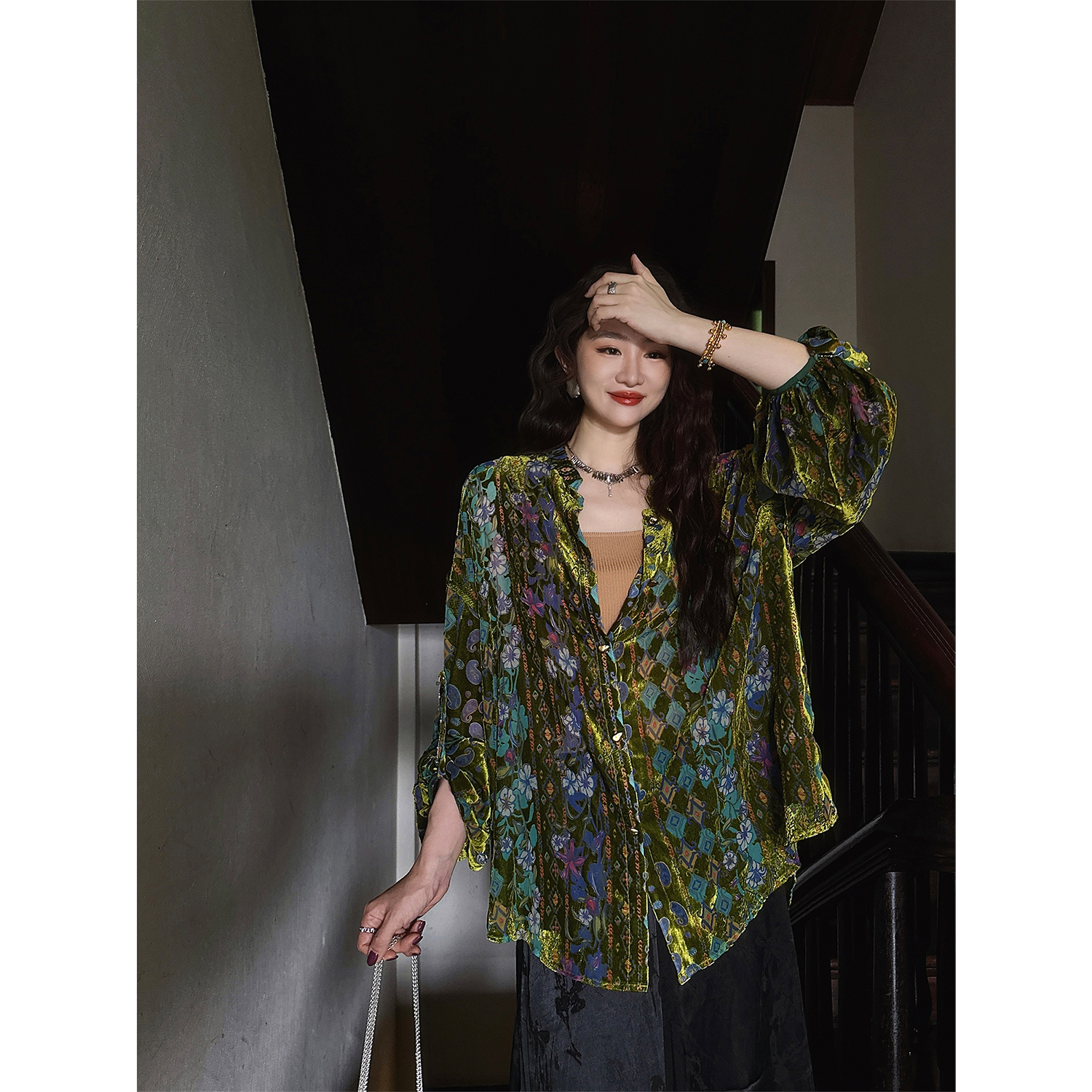 [Yang Mi Mid-Autumn Festival Same style] Sanji black flower [Flower window shadow] new Chinese national velvet blouse shirt women's jacket
