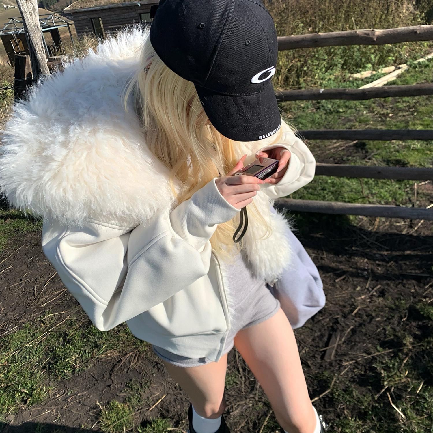 Rase le sol 'Love of Fate' white fur collar with fleece cropped hooded thickened sweatshirt jacket