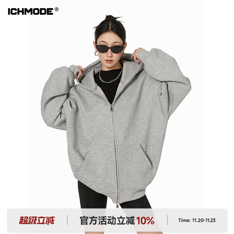 ICH MODE American gray sweatshirt jacket women's autumn and winter new loose hooded zipper cardigan lazy top