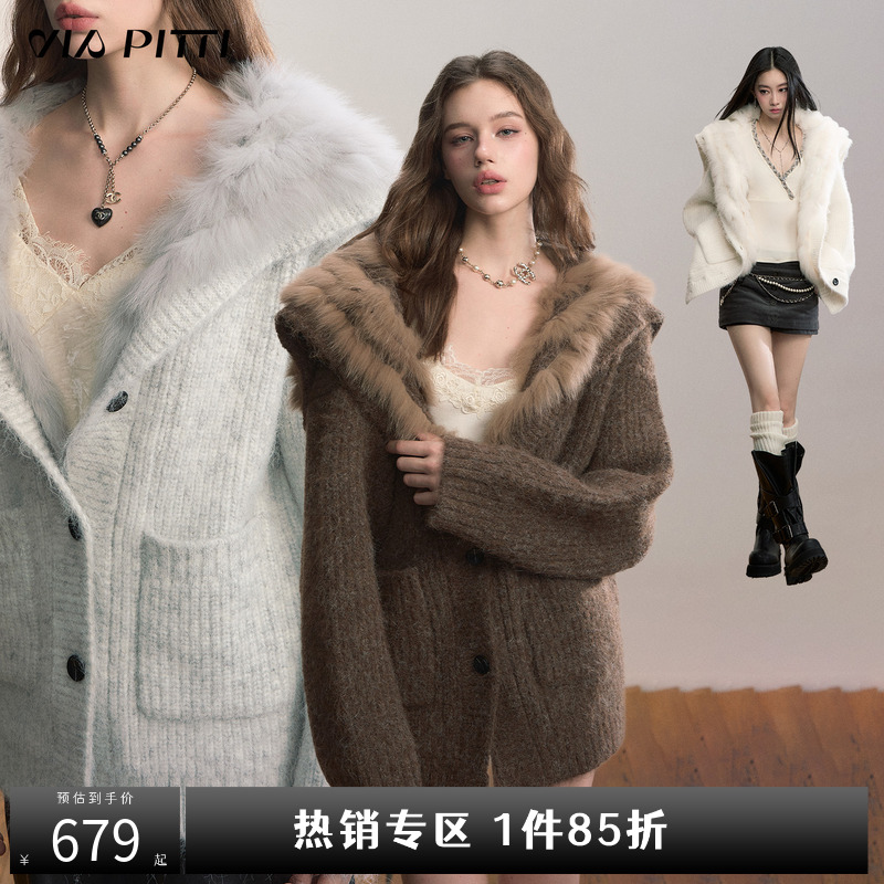 VIAPITTI design heavy fox fur large lapel warm plush sweater jacket women's autumn and winter cardigan