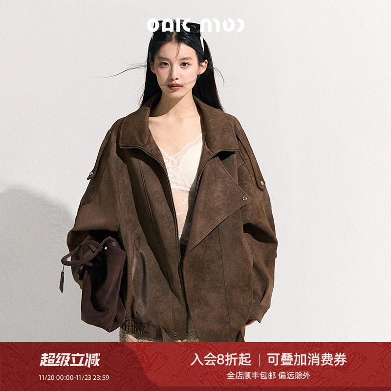 OAKMOO/ "Ginger & Flowers" Maillard leather jacket suede texture biker jacket vintage cargo short coat