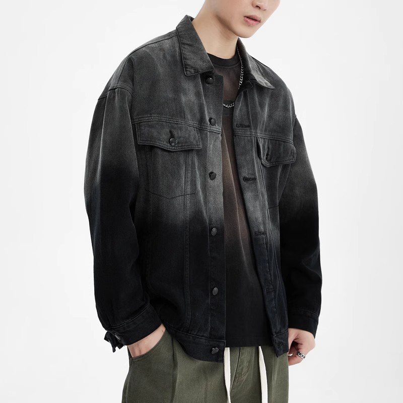 2025 new gradient black and gray denim jacket men's spring and autumn retro high-end ruffian handsome loose cargo jacket