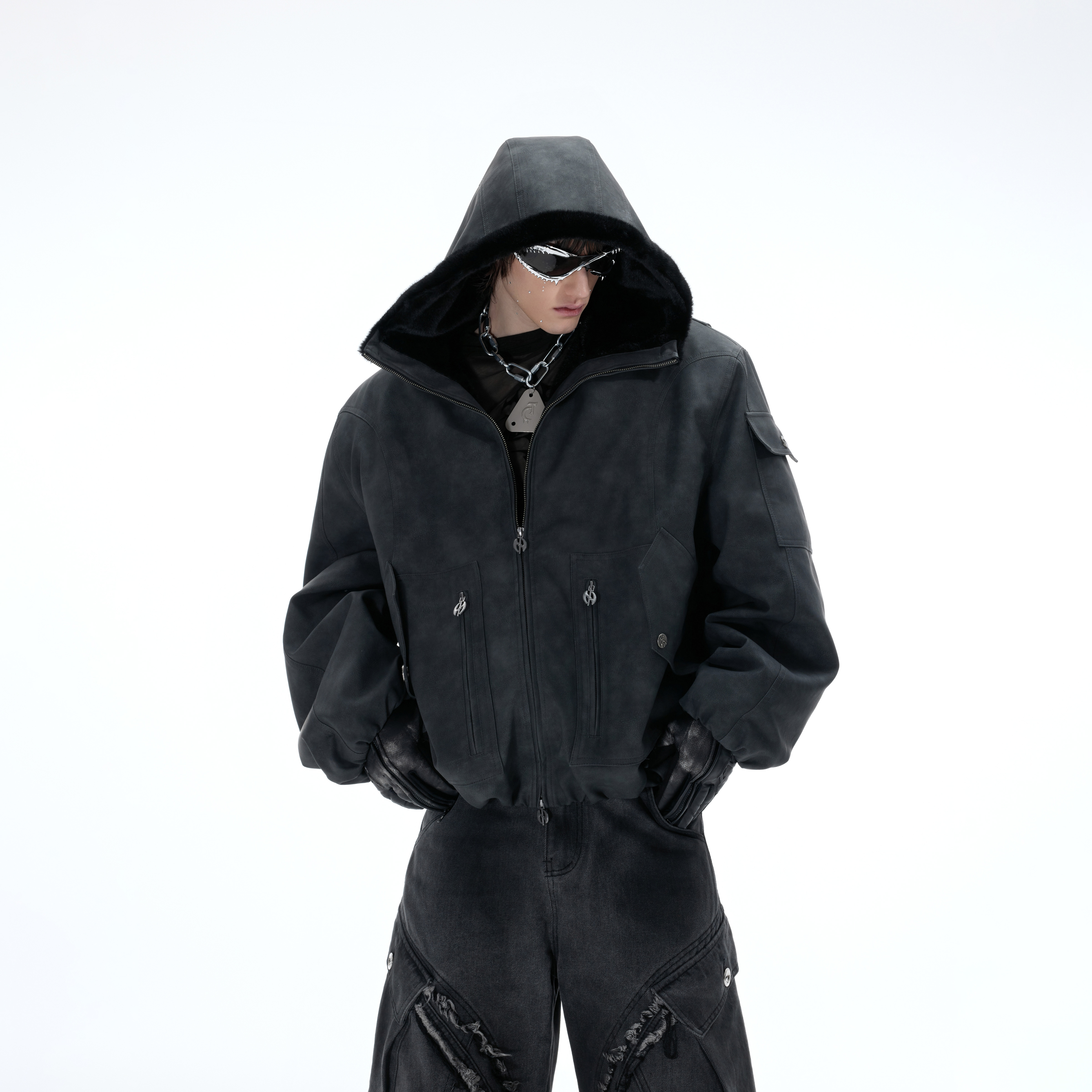 No faith studios N2B fur collar hooded flight jacket heavy wash old Bomber cotton suit