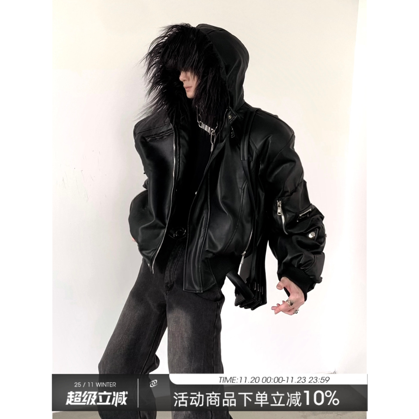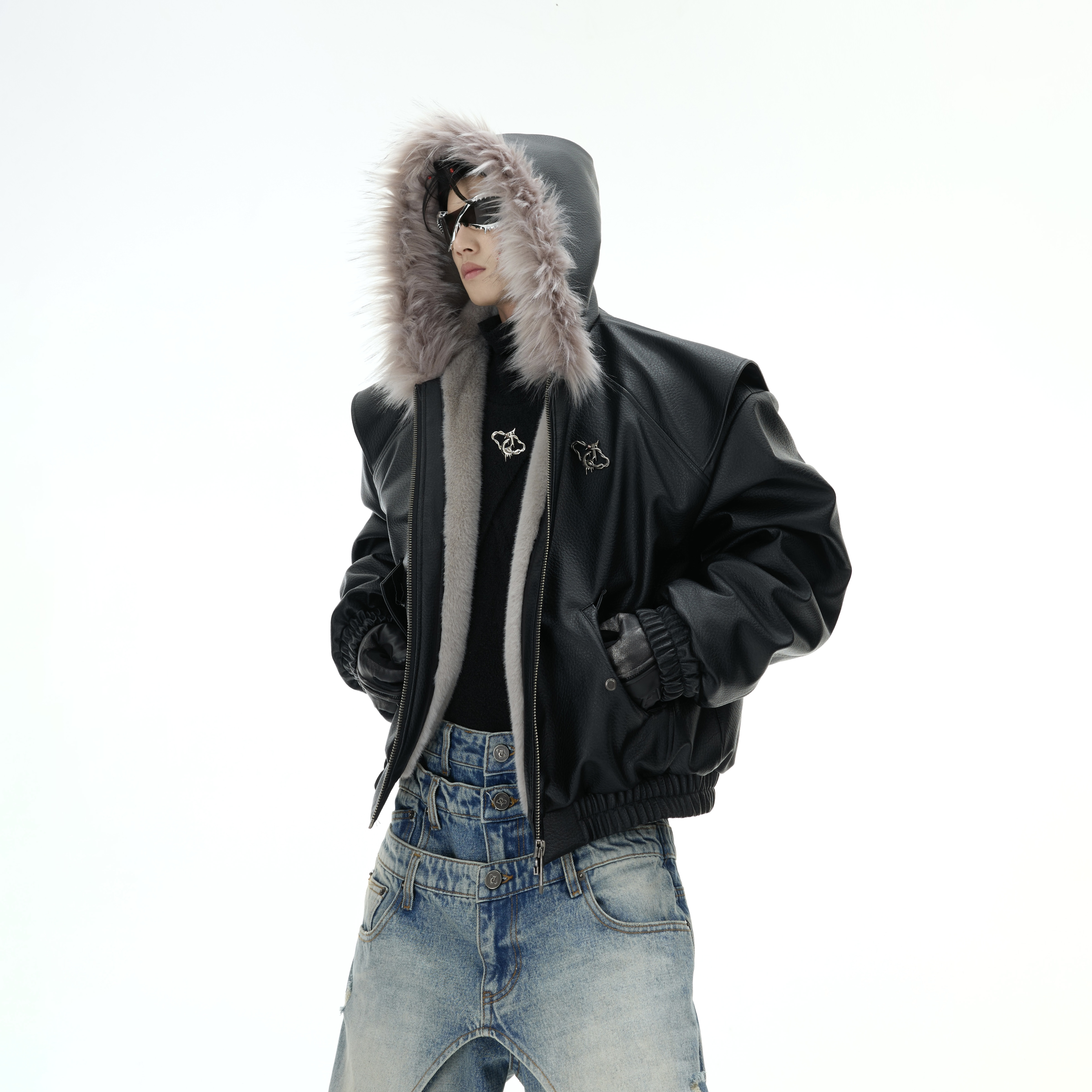 Detachable hat fur collar PU lint jacket men's and women's winter American cleanfit cropped bread suit hooded jacket