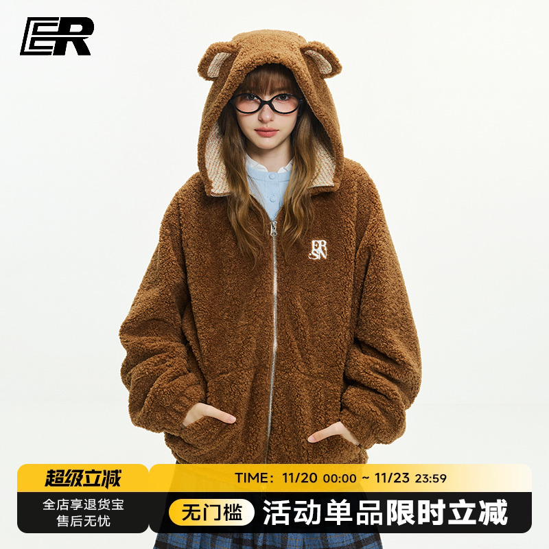 ER small fragrance cute bear ears, lazy wind, imitation lambswool jacket, autumn and winter warm hooded cotton clothes cardigan