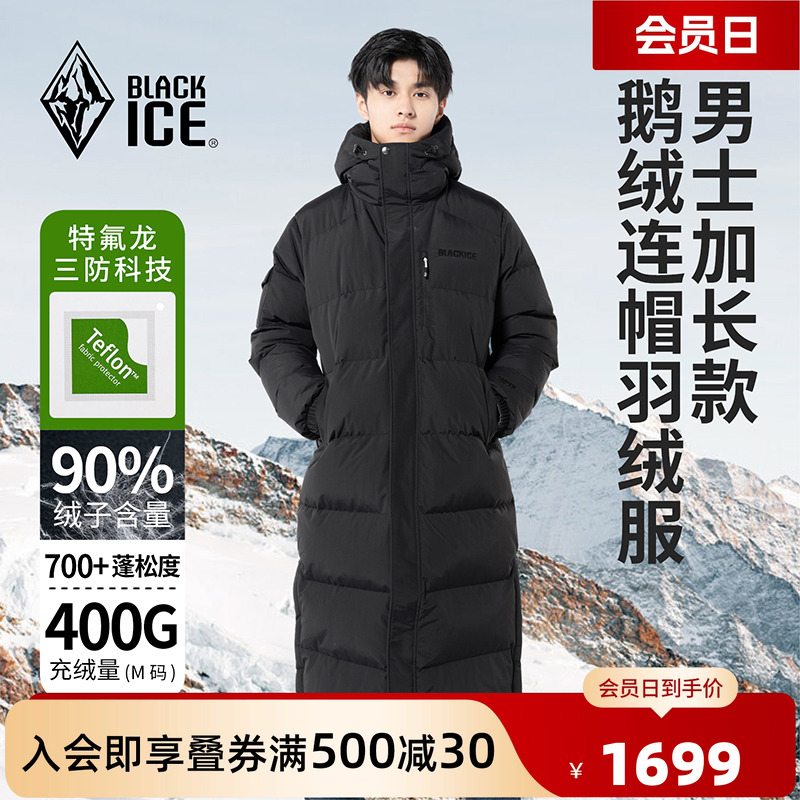 Black ice winter warmth, cold-resistant, elongated, thickened, hooded, goose down, down jacket, men's over-the-knee coat, 8575