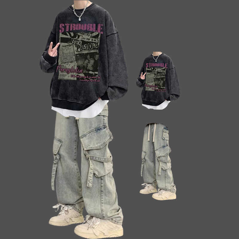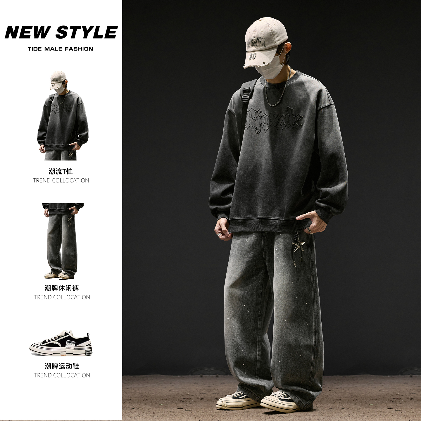 Fashion suit men's autumn and winter retro men's sweatshirt with American straight-leg men's pants for boys to wear a handsome set