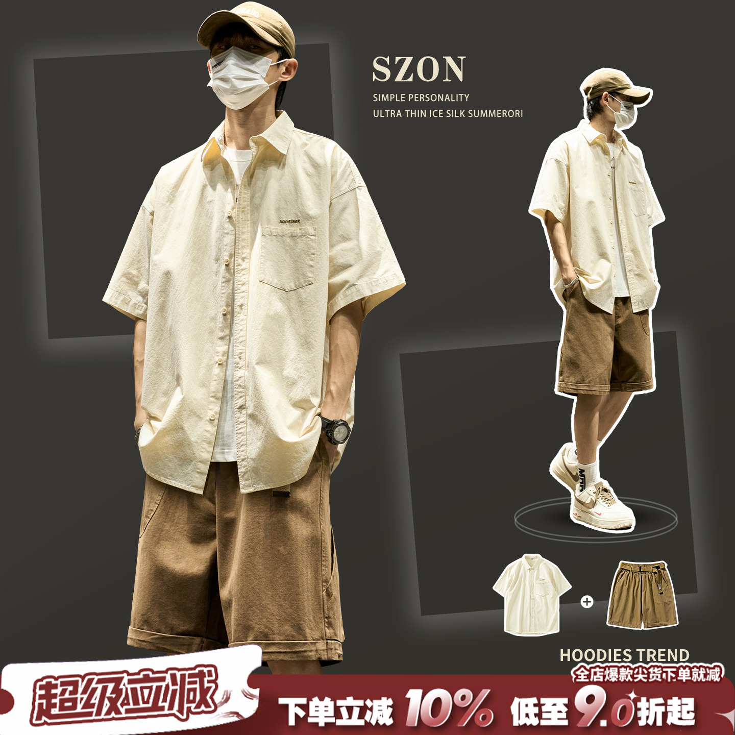 American casual suit men's summer 2025 new ruffian handsome outfit with short-sleeved shirt cargo cropped pants with a set