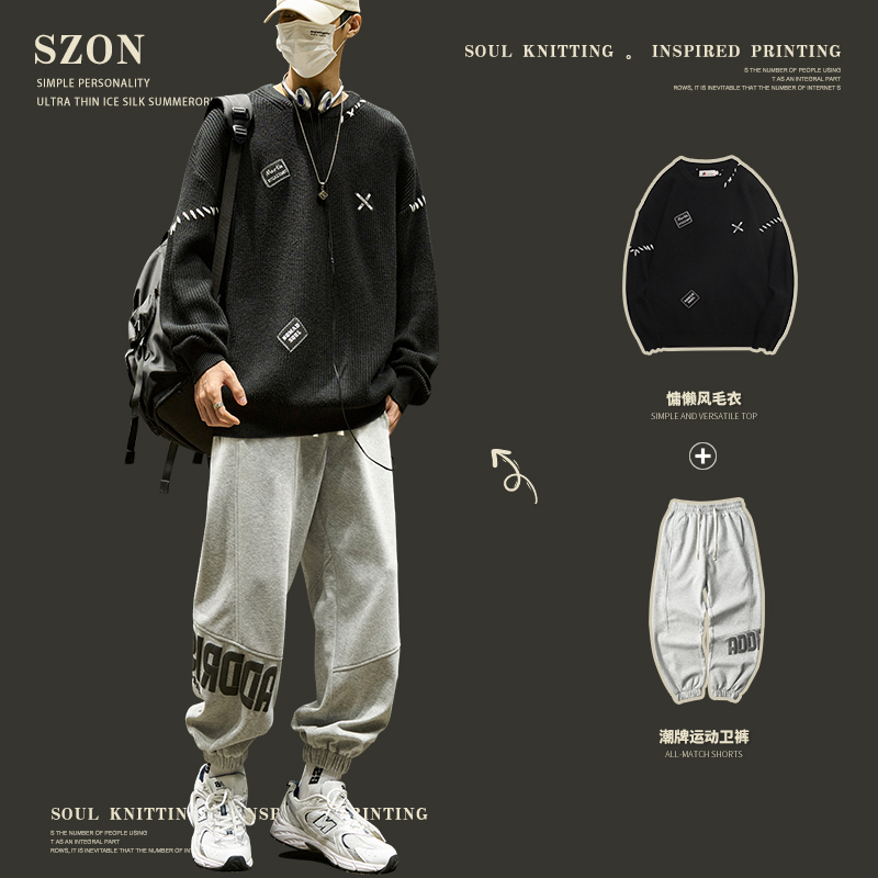 Suit men's autumn/winter 2025 new loose and lazy style wears a full set of crew neck sweaters with heavy sweaters
