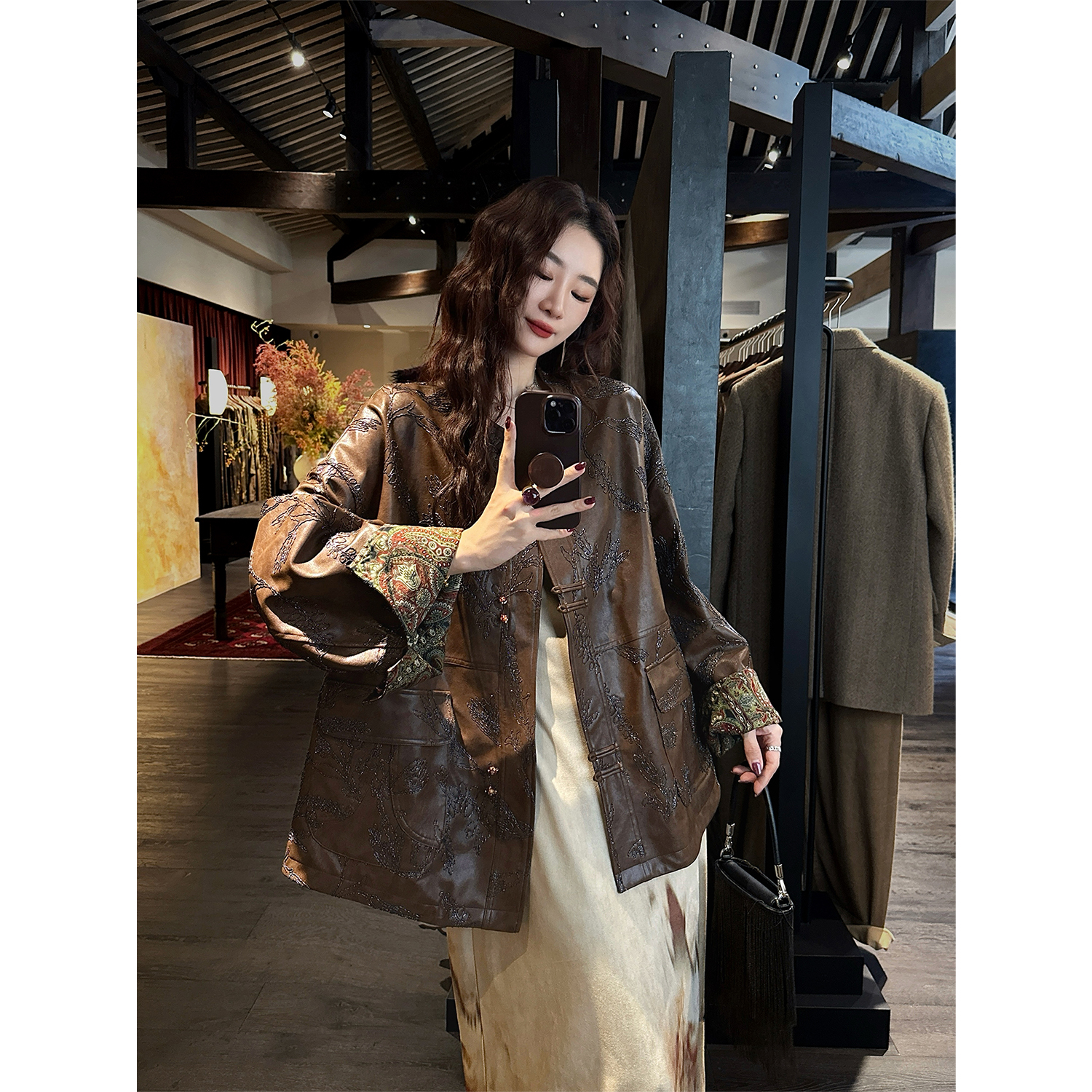 Sanji Black Flower [Star Reaching] New Chinese Leather Jacket Women's 2025 New Retro Super Fire National Style Jacket Cool Style