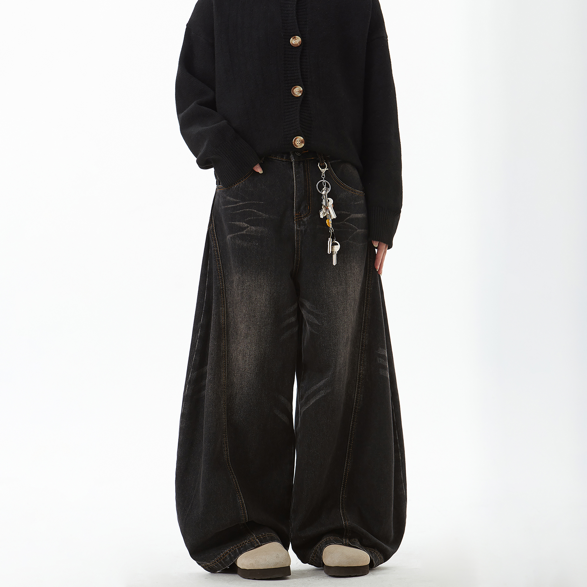 Woostop vintage black scimitar jeans men's trendy American washed cat whiskers draped wide-leg sickle pants