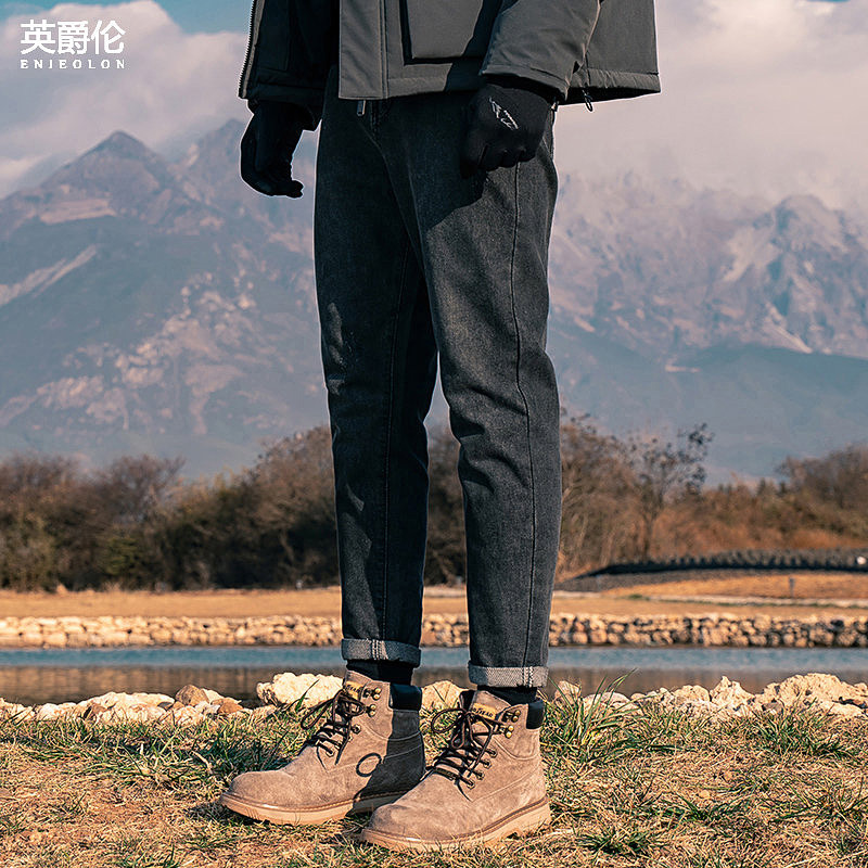 Engjae Lun's fleece thickened stretch jeans men's autumn and winter slim straight trousers American cat's paw winter pants