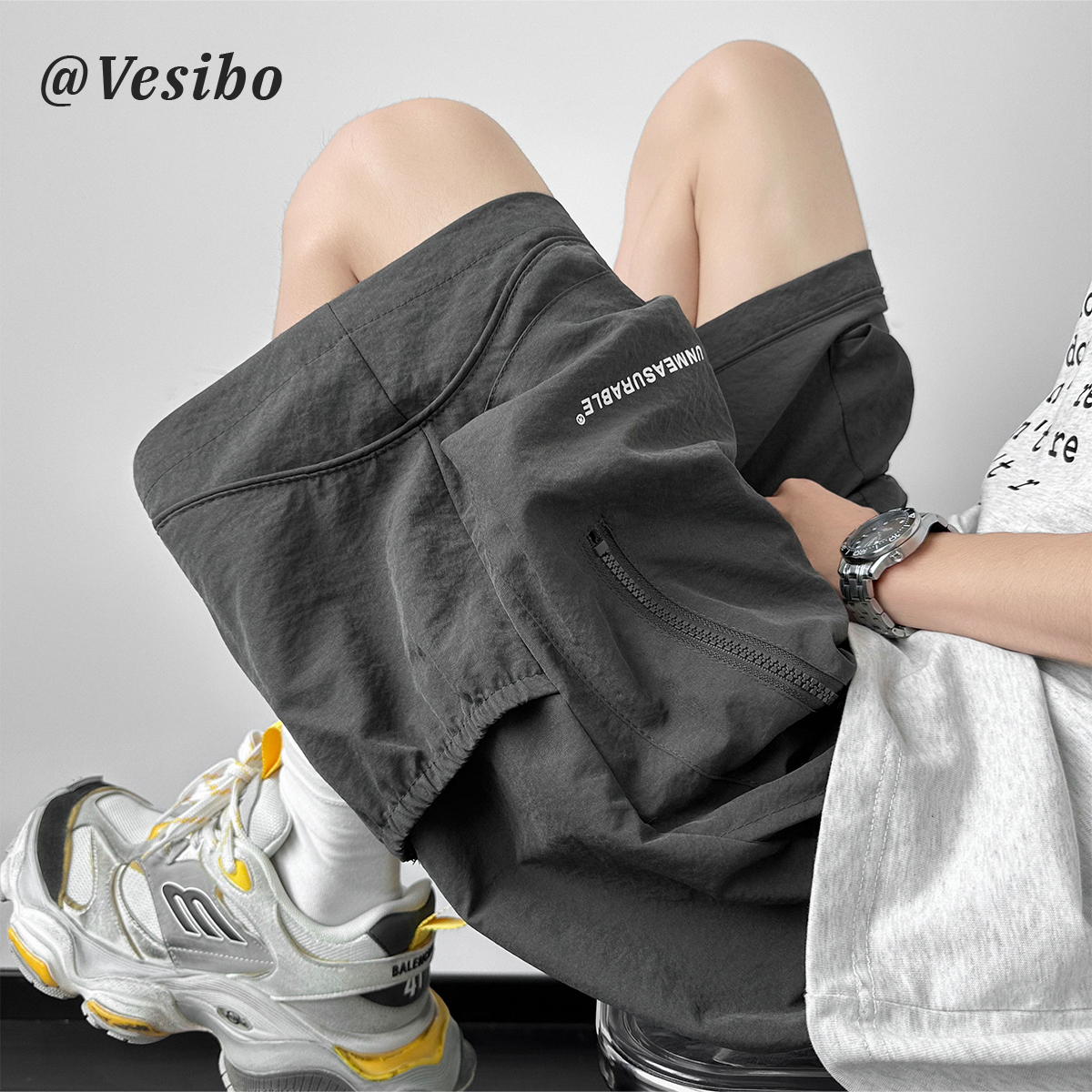 Dark gray wide-leg sports shorts, men's summer American zipper, large pocket cropped pants, trendy brand quick-drying cargo pants