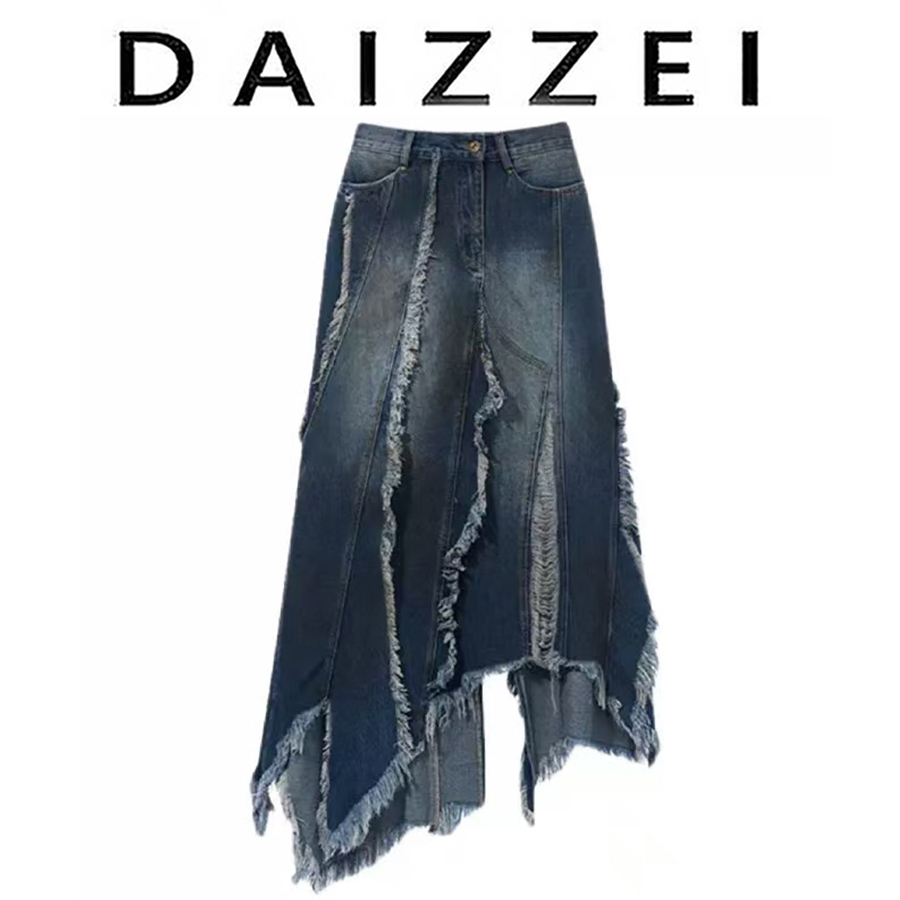 DAIZZEI~ high-end sense irregular distressed raw edge tassel design denim half length skirt women's spring and summer new trend