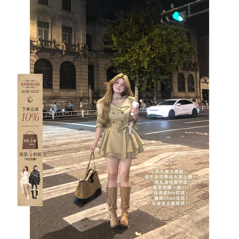 Annie is not popular autumn leaf trench dress women's autumn and winter slightly chubby plus size design sense large lapel double-breasted lace-up flower bud skirt