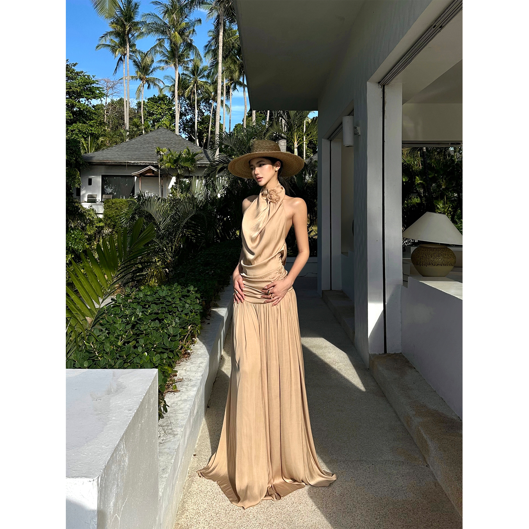rovente Eaton beauty halterneck swing collar dress temperament celebrity dress seaside suspender backless long skirt