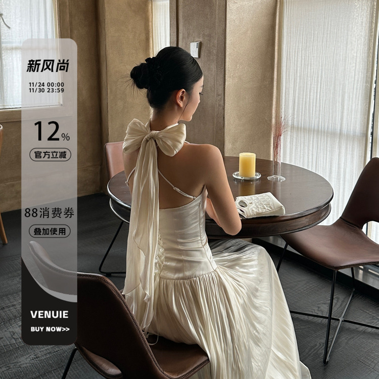 VENUIE French halterneck dress can be worn daily for engagement evening birthday small light dress skirt temperament beautiful long skirt