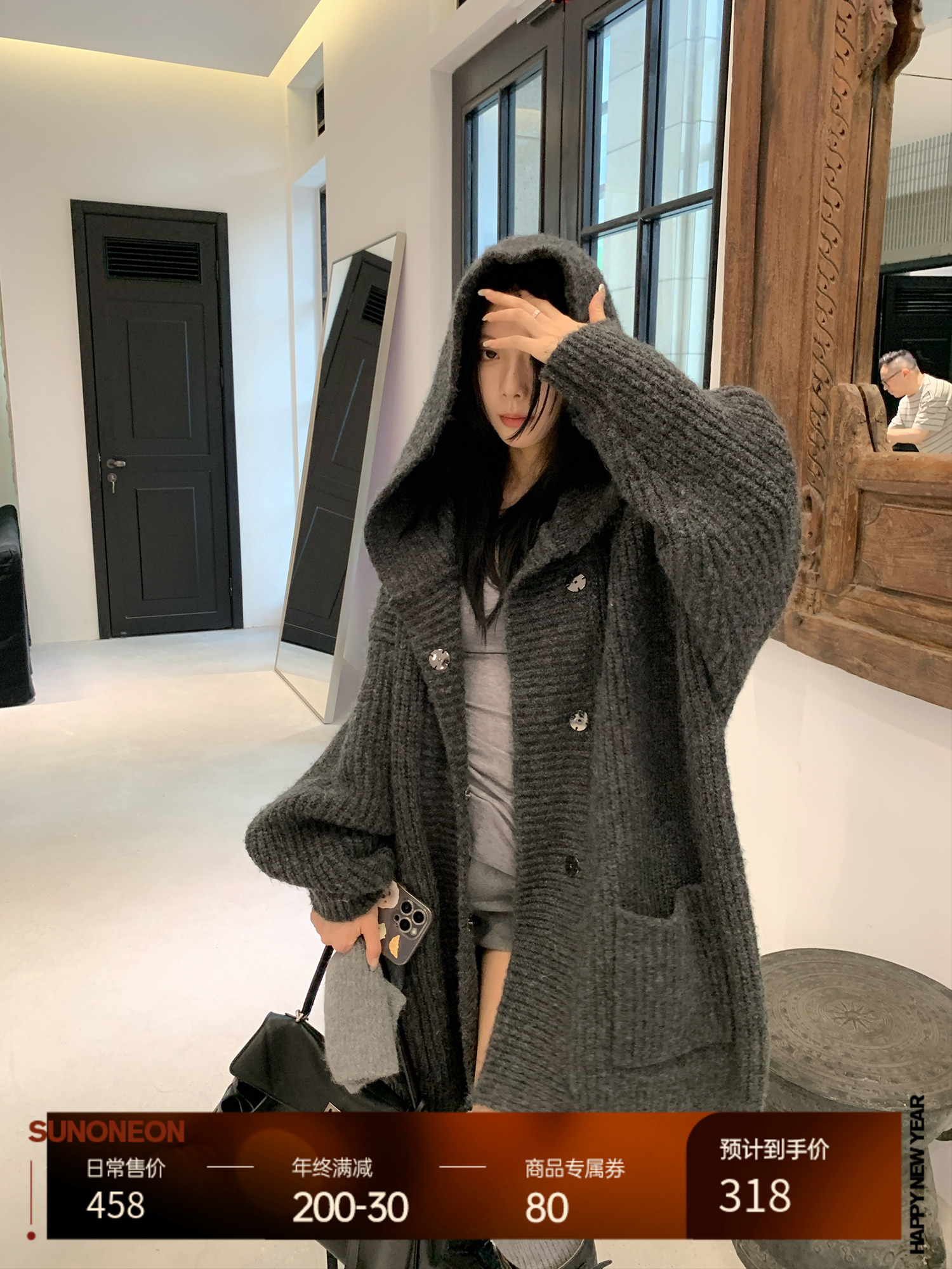[In Stock] Sunoneone Loose Wool Hooded Large Outwear Women Winter French Retro Gray Knitting Tops