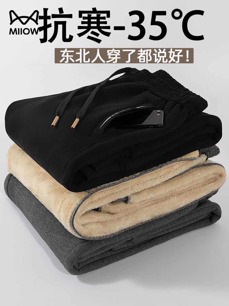 Catman Cashmere Fleece-lined thickened Outwear Sports Casual Pants Men's Pants Winter Heattech Cotton Pants Straight-leg Loose Sweatpants