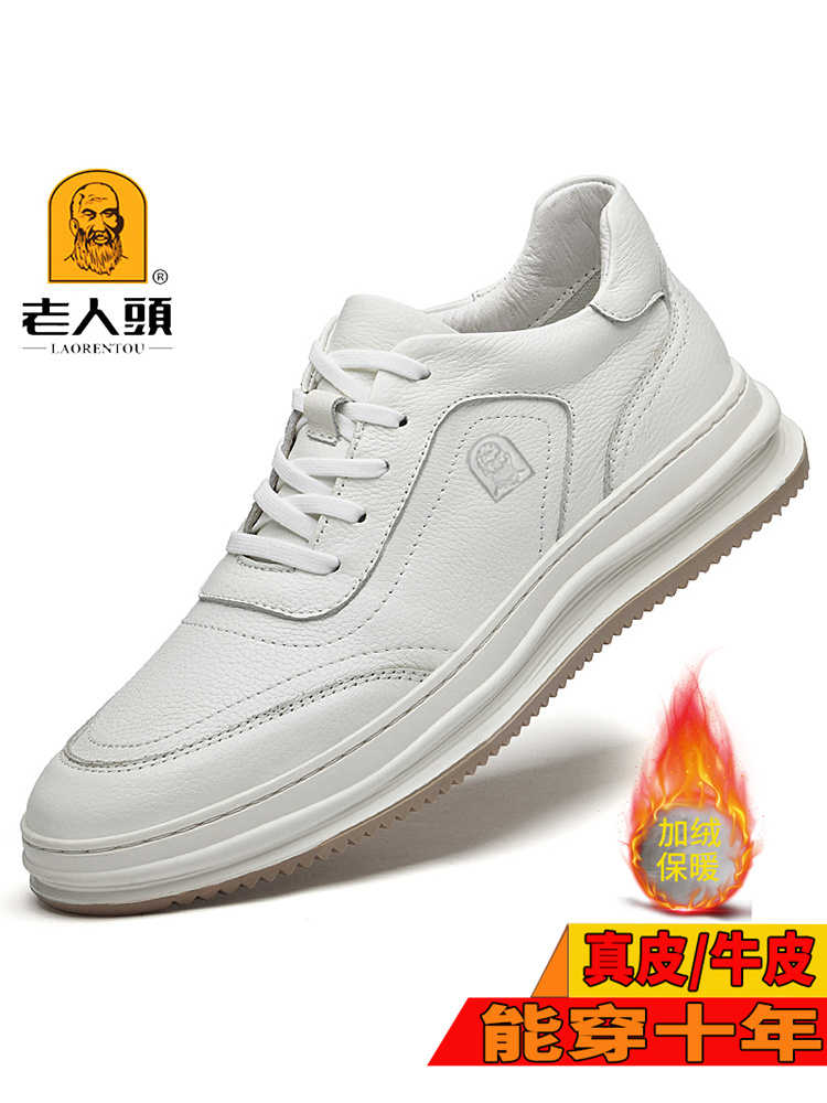 Old Man's Head Men's Shoes Fall and winter Genuine Leather Breathable White Shoes Men's Casual Shoes Thick Sole Versatile Sneakers Fleece-lined Heattech Cotton Shoes