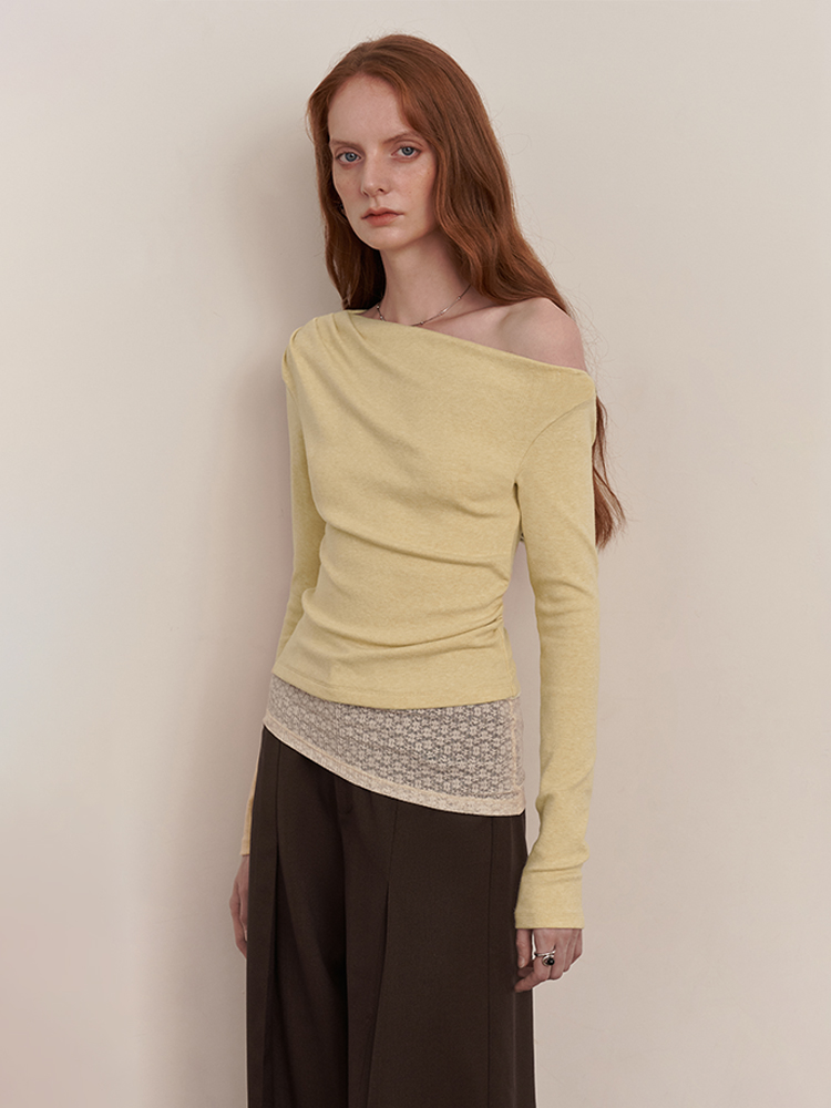 Someone Sometimes Original Lace Splicing Asymmetrical Waist-Cinching Faux Cashmere Feel Swing Collar Knit T-Shirt
