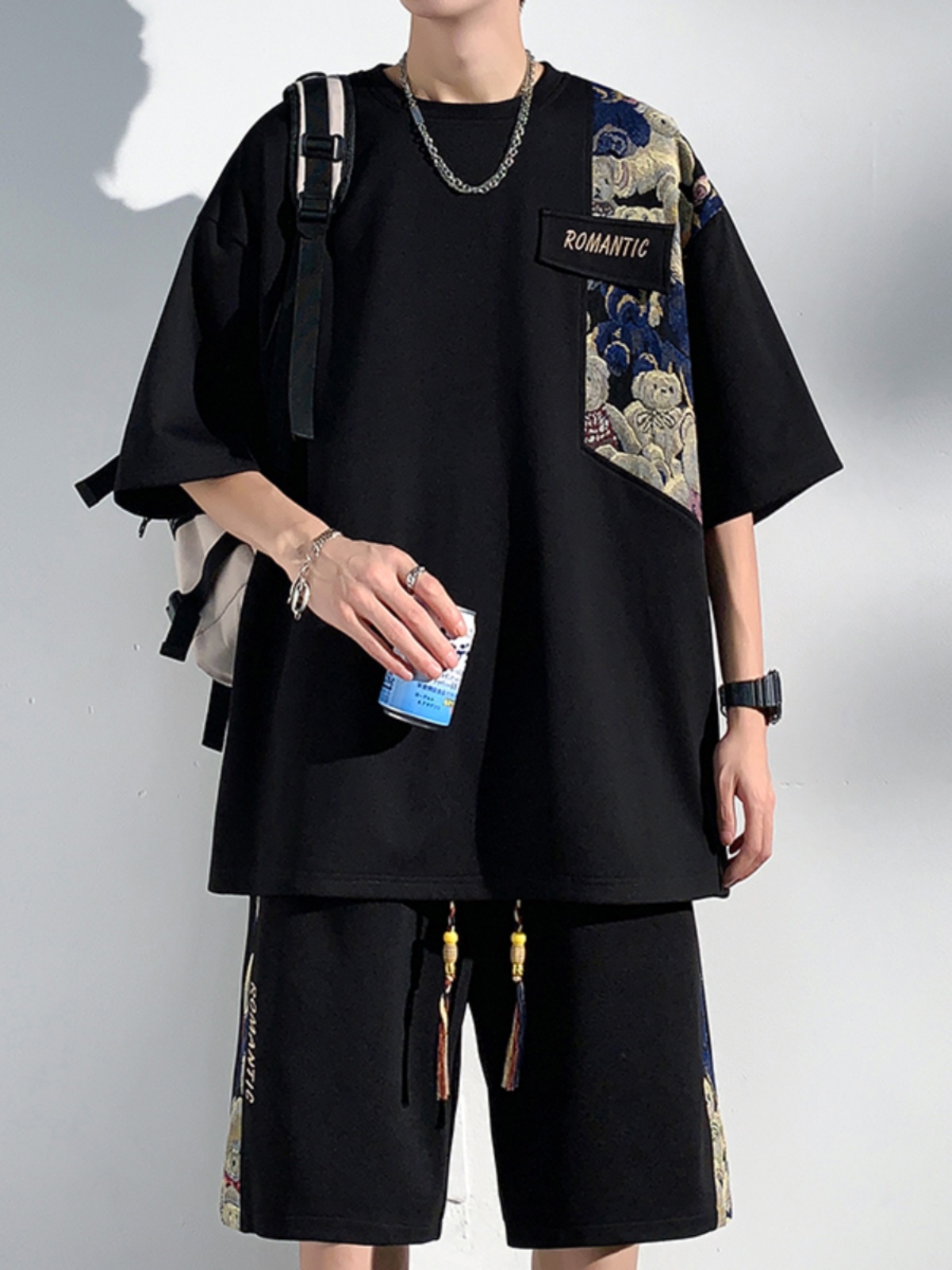 Chinese Style Men's Summer Outfit, Trendy Brand Patchwork, Two-Piece Set, Loose Casual Plus Size Short-Sleeve Bear Shorts