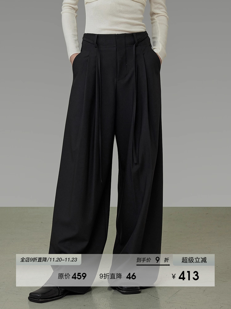Unspoken Black Lace-Up Pleated Wide-Leg Pants for Women, Autumn 2025 New Style, Loose, High-End, Slimming Long Pants