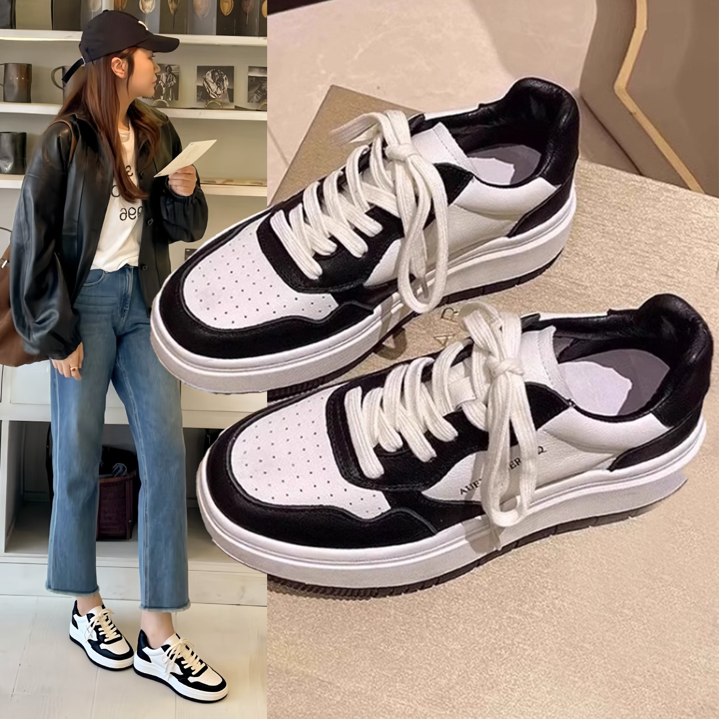 Hong Kong Flat Casual Sneakers for Women, Spring and Autumn, Panda Color, Lace-Up, Versatile, Height-Increasing, Genuine Leather, Thick-Soled, Student White Shoes