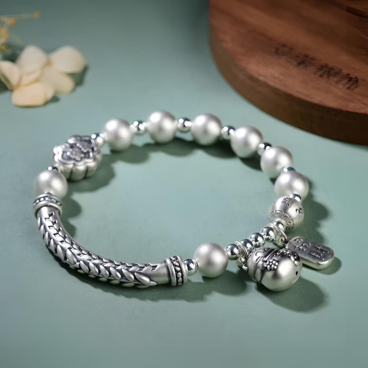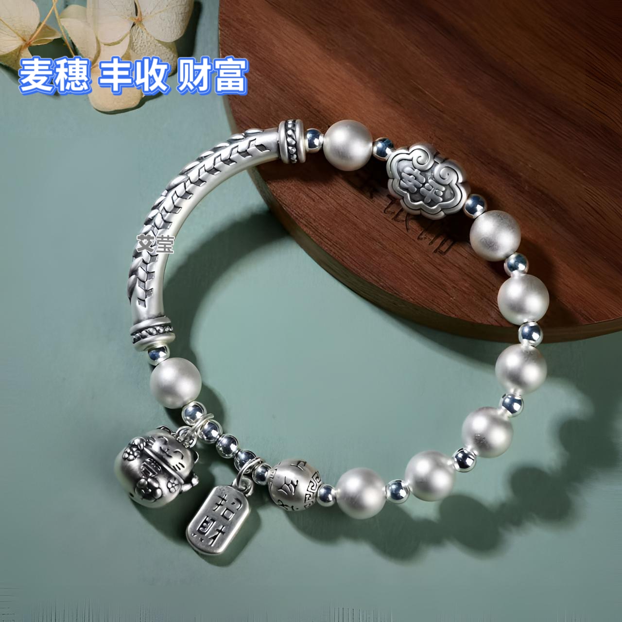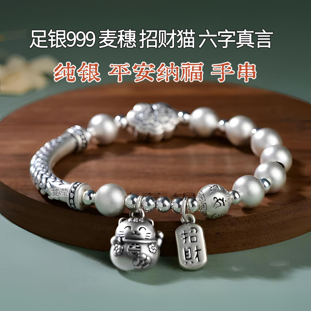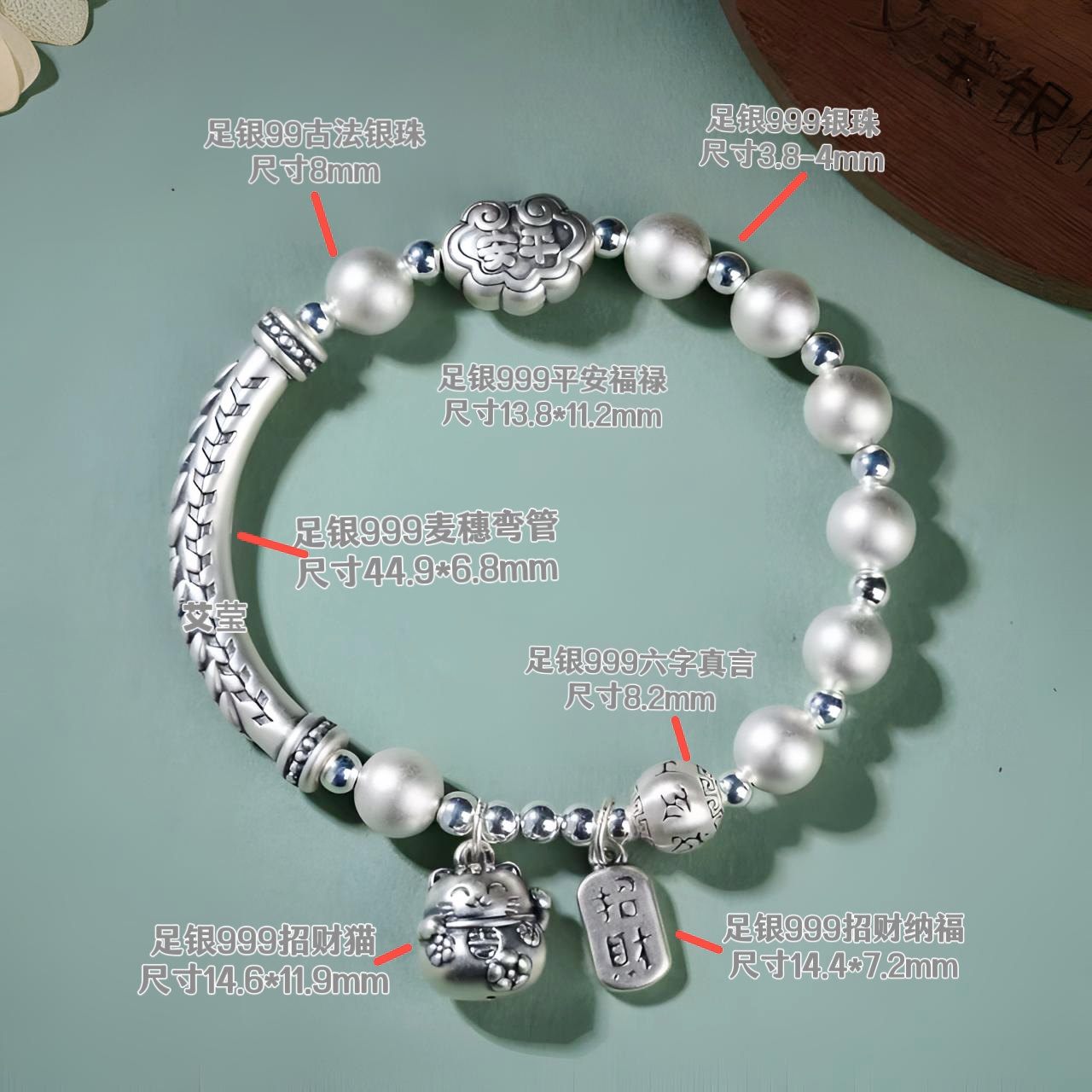 999 Pure Silver Wheat Ear Lucky Cat Bracelet for Women, Traditional Silver Bead Bracelet with the Character for Good Fortune, Peace Lock Half-Bracelet