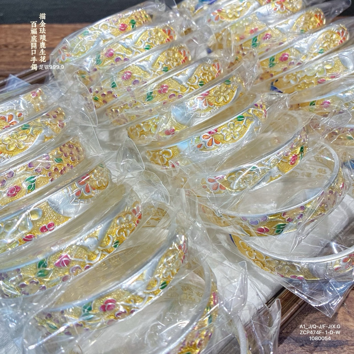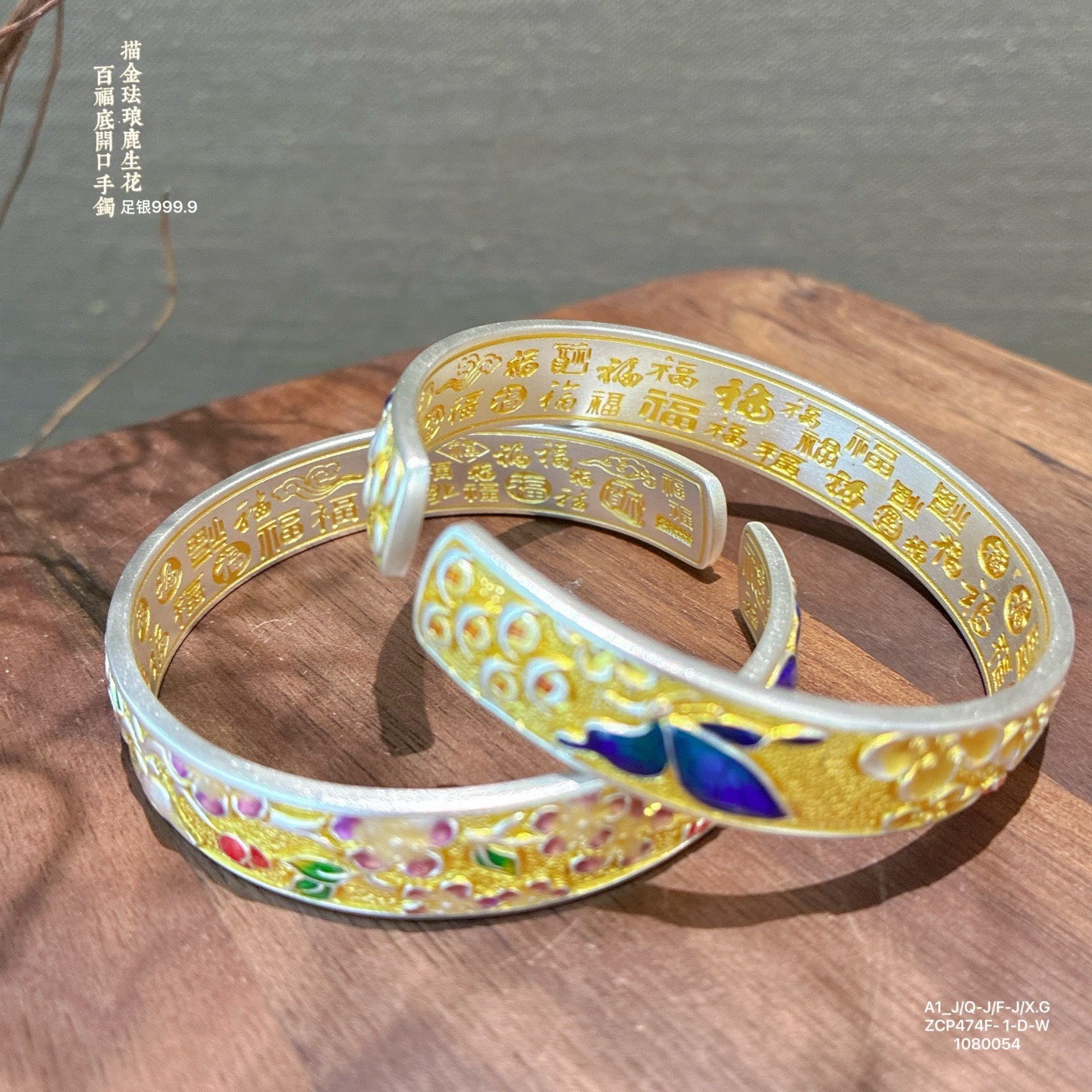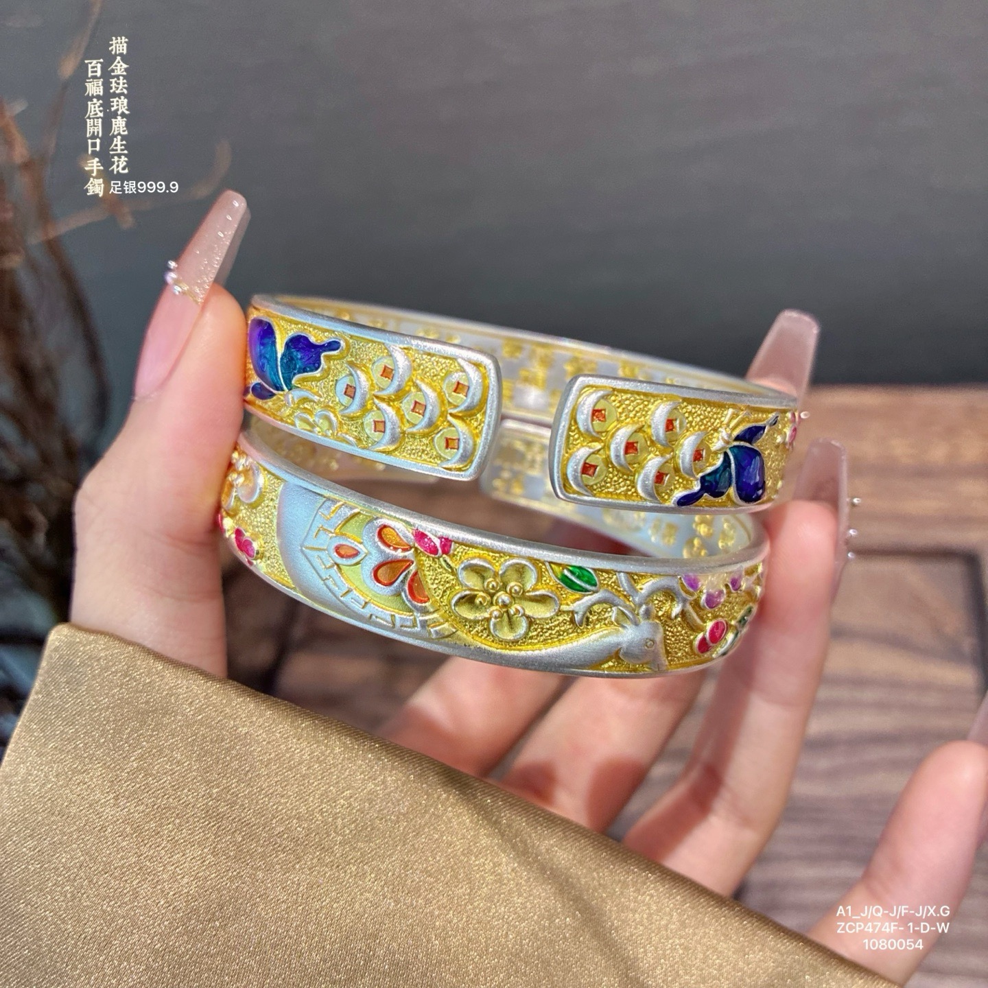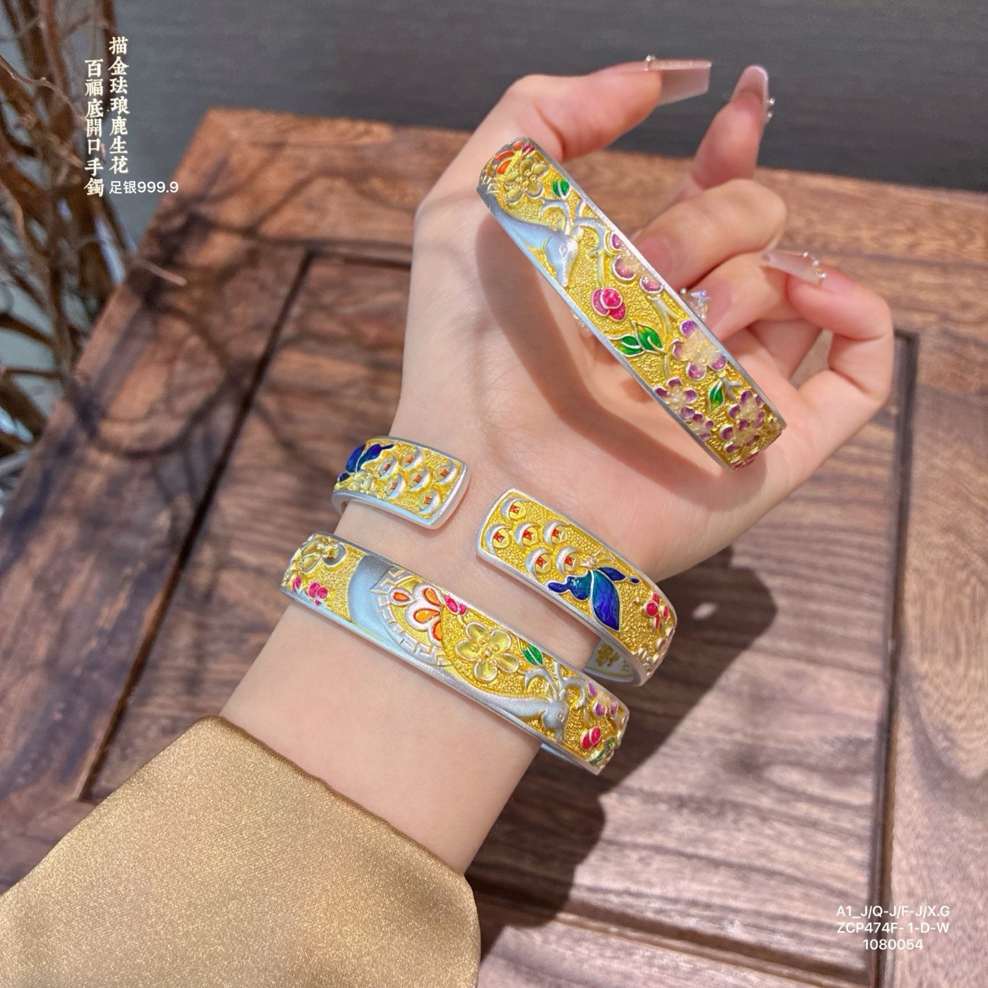 Yilushenghua 9999 Pure Silver Open-Ended Gold-Plated Bracelet for Women, Pure Silver Enamel, Chinese Style, Gift for Elders