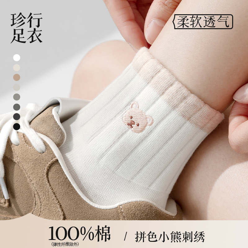 Socks women's spring and autumn bear embroidered white school socks are cute moisture-wicking and breathable cotton short socks