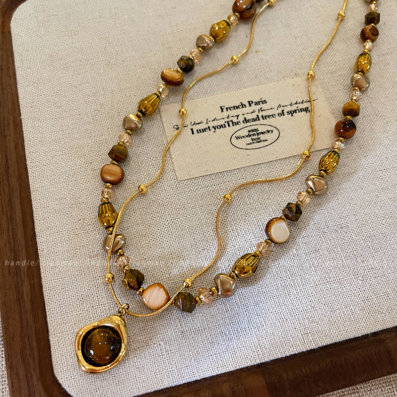 【Peach Tea】Wutong Amber Long Natural Stone Ceramic Pendant Necklace Chinese Ethnic Style Halterneck Accessories