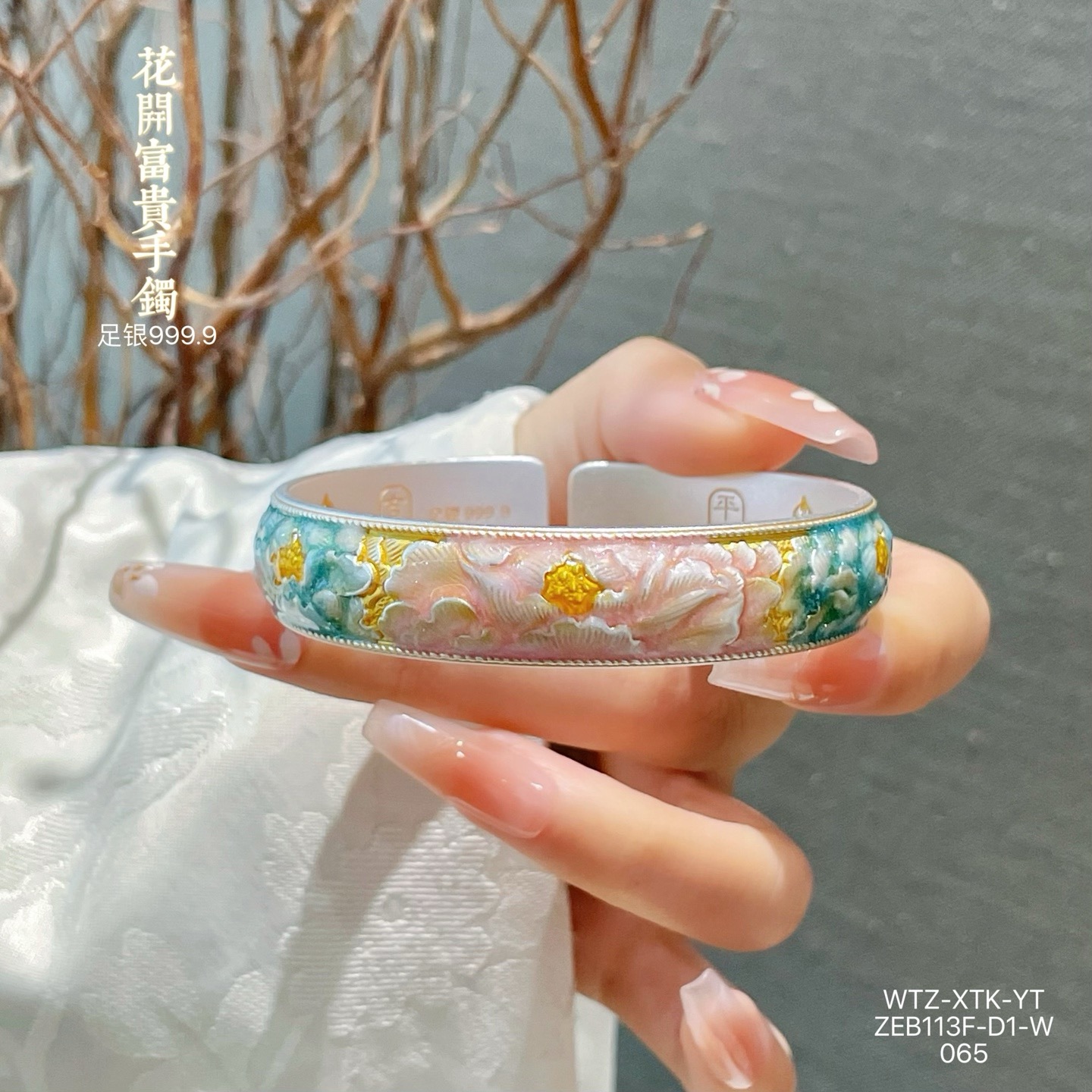 "Flowers Bloom and Wealth" Pure Silver 9999 Gold-Painted Enamel Colored Bracelet Women's Sterling Silver New Chinese Versatile Open Bracelet