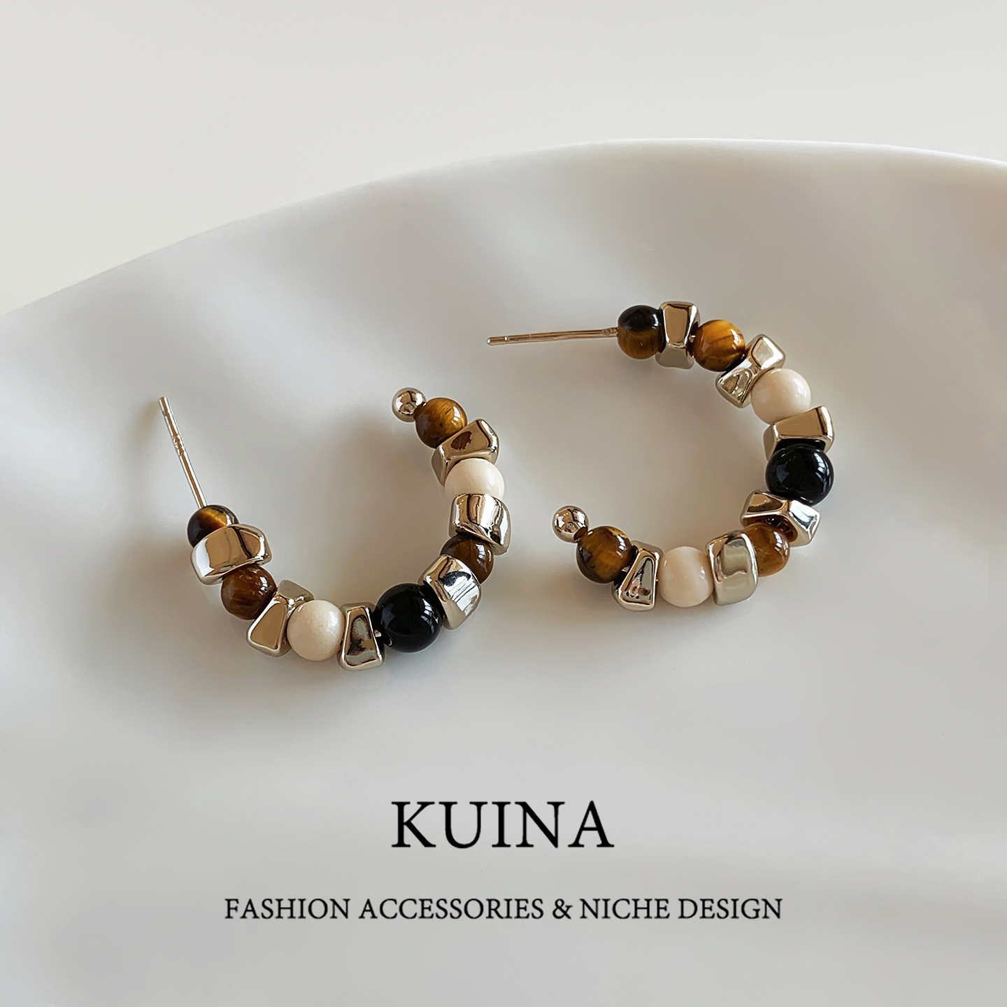 Niche high-end Maillard natural tiger's eye stone hoop earrings women's French light luxury design earrings earrings