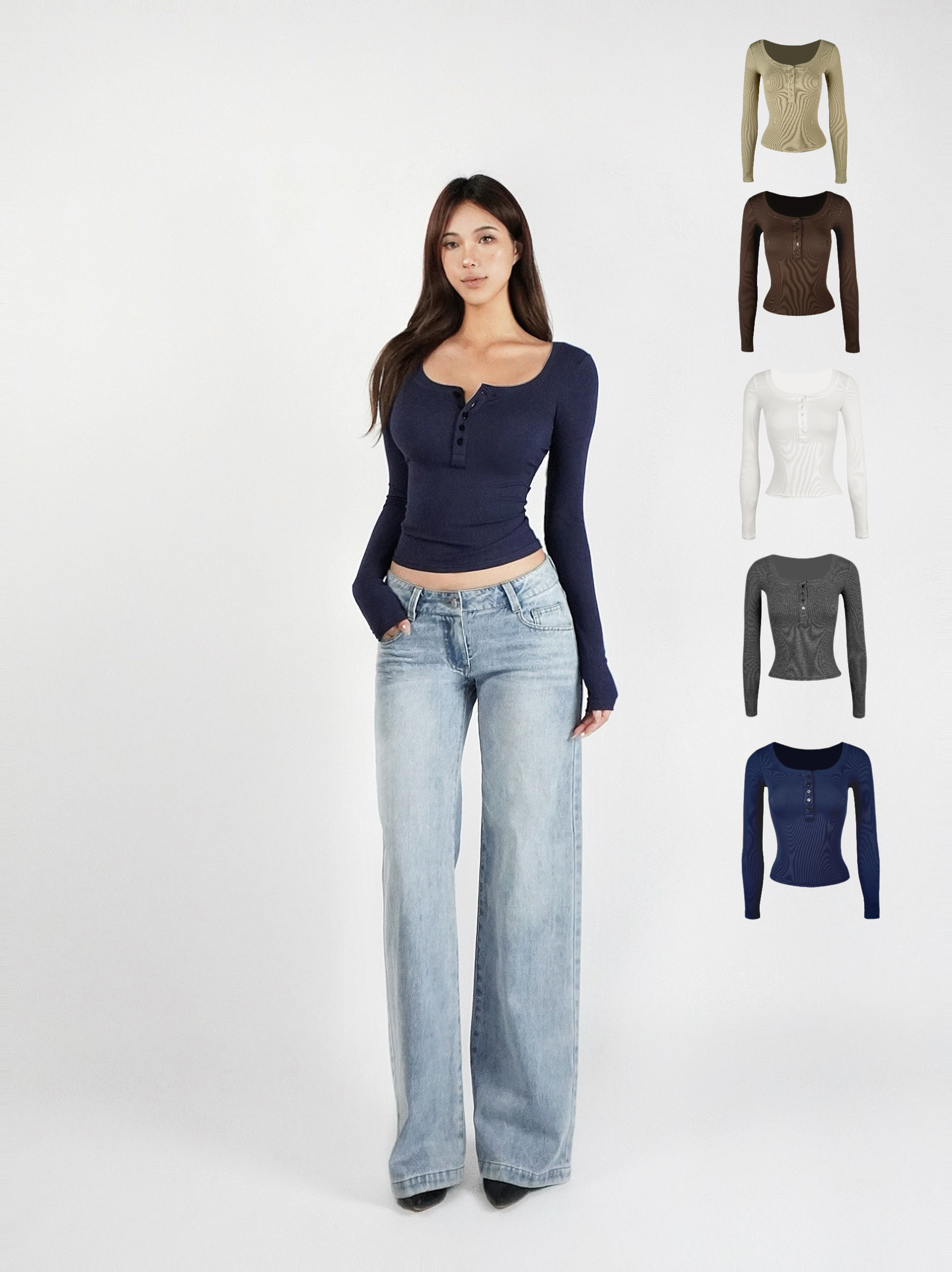 Jim Kennet Basic U-Neck Stretch Slim Fit Henry Long Sleeve T-Shirt