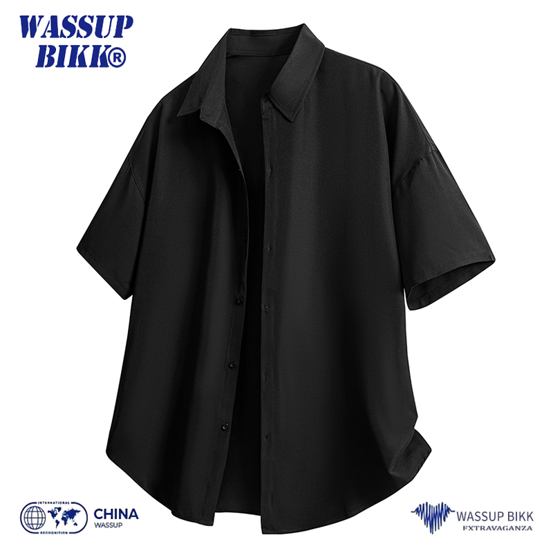 WASSUP BIKK draped ice silk black short-sleeved shirt men's summer solid color loose half-sleeved shirt jacket