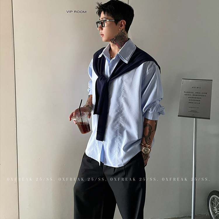 OXFREAK "Detachable Shawl" Blue Stripe Long Sleeve Shirt Men's Design Niche Loose Silhouette Shirt