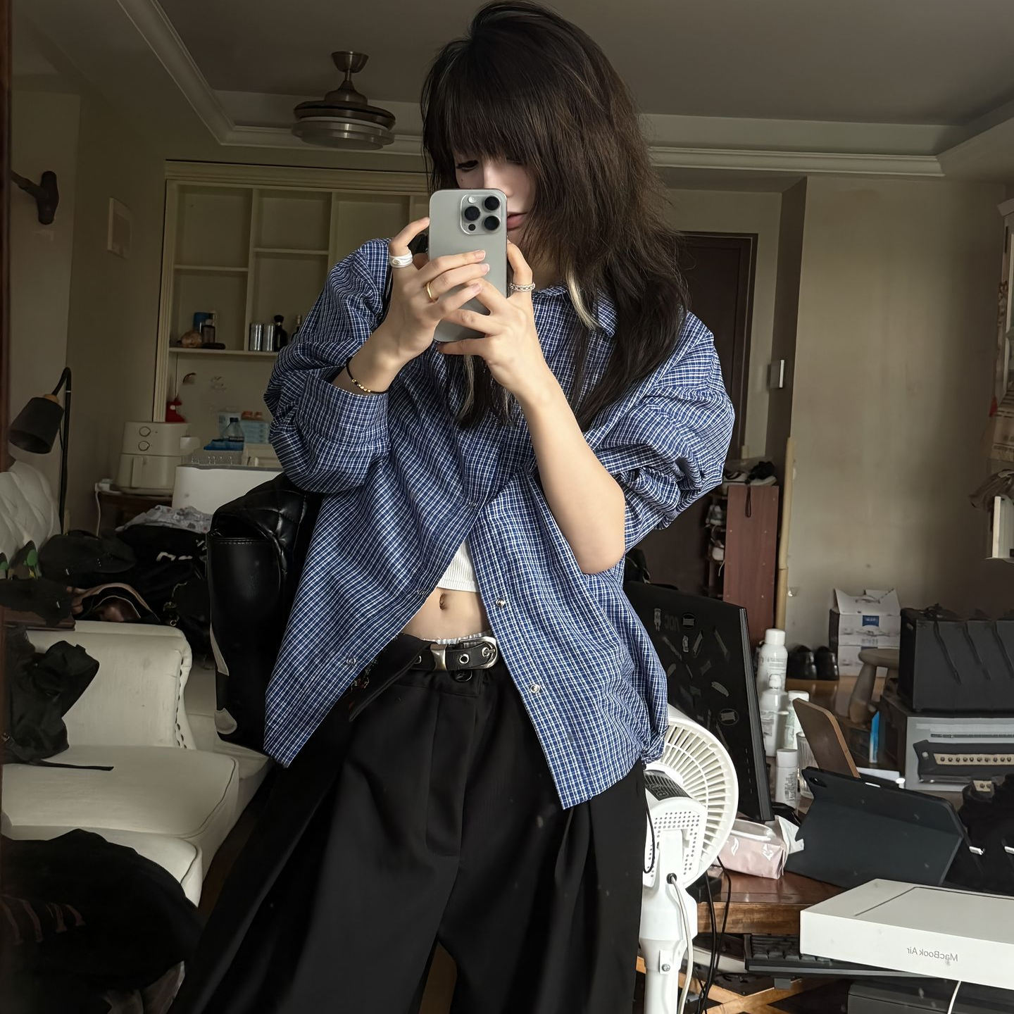 South Korea Royal Blue MIU Autumn and Winter Versatile Plaid Drawstring Cleanfit Three-dimensional Short and Wide Long Sleeve Shirt