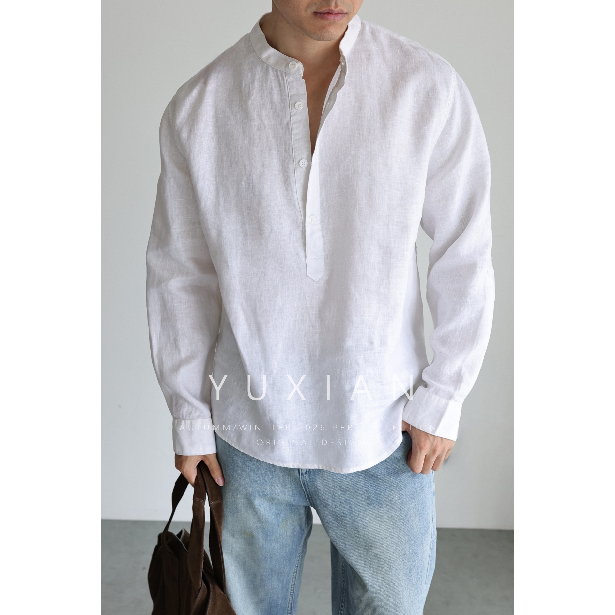 [100% linen] Italian old money stand-up collar buttons breathable and moisture-absorbing casual commuter linen long sleeve shirt men