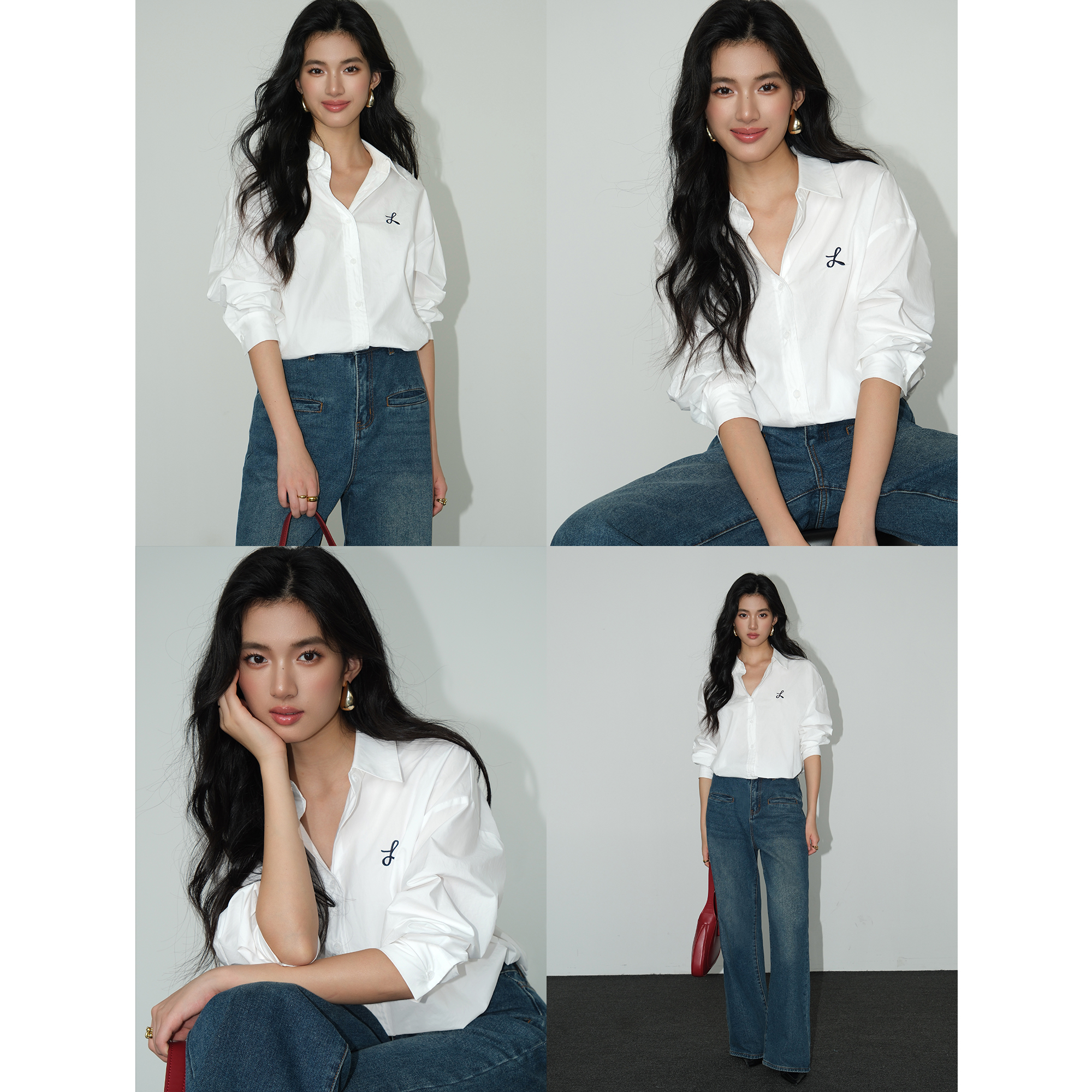 NEVA HU white long-sleeved shirt women's loose 2025 new embroidered design niche Korean version versatile shirt