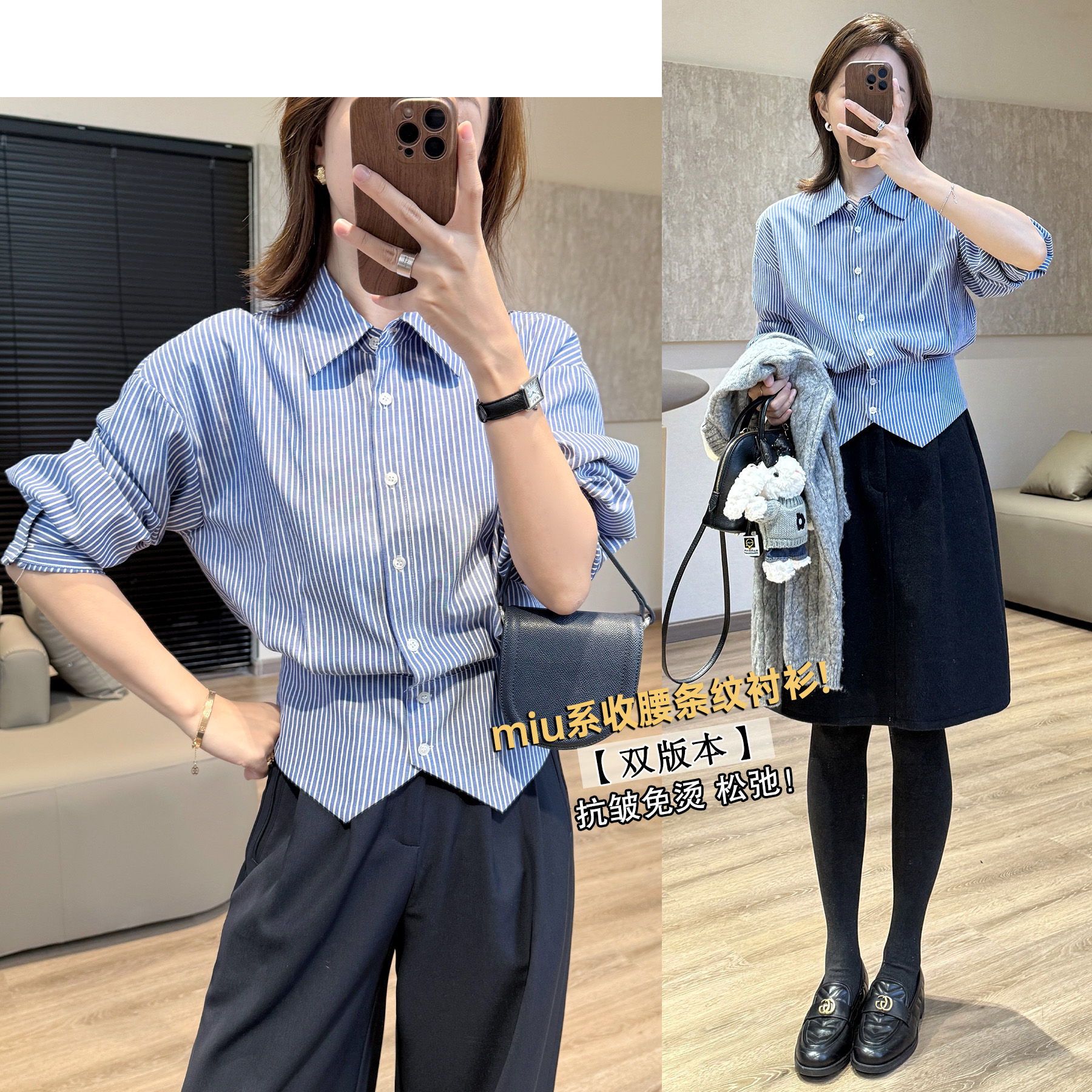 Liang Xiaoliang Miu striped shirt [Dual version] anti-wrinkle and non-iron quality design sense waist high-waisted shirt