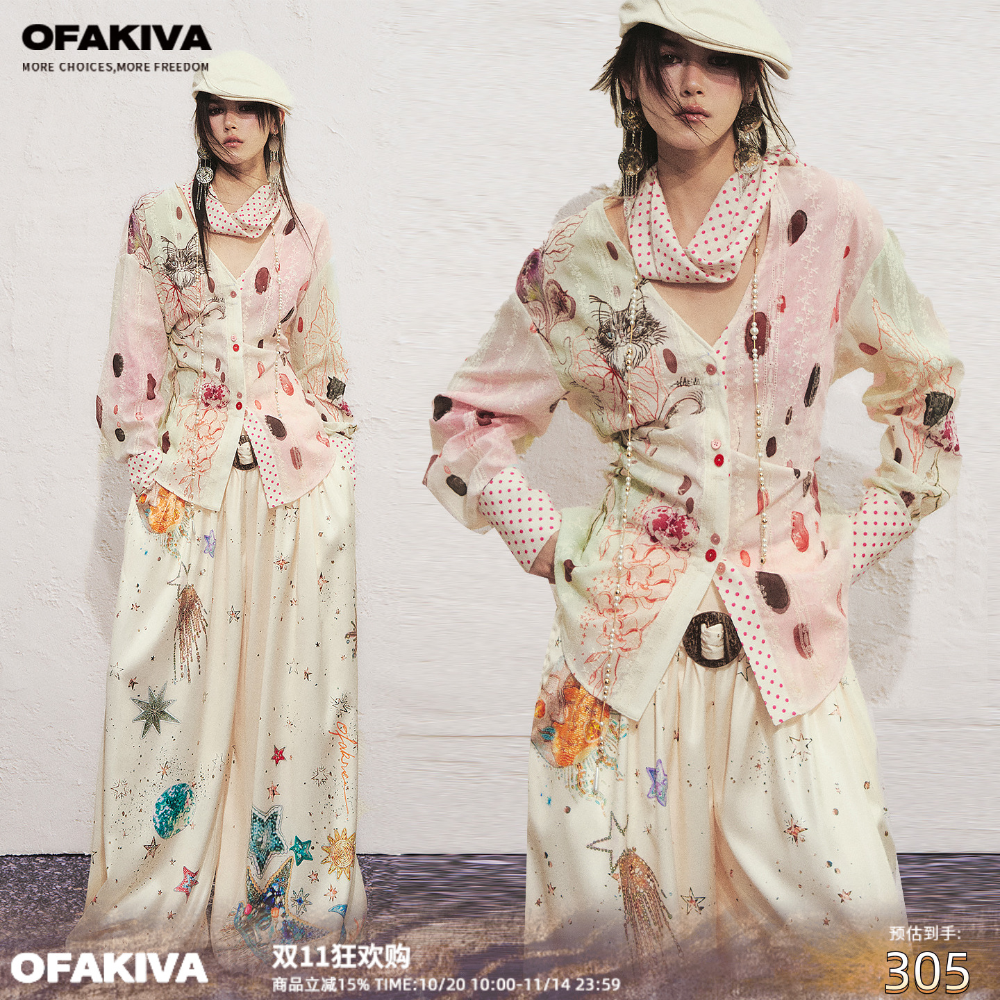 OfAkiva "Horus" Hand-painted watercolor cat print shirt women's polka dot scarf lace-up waist shirt