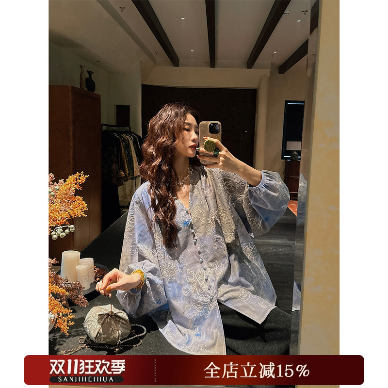 Sanji Heihua [Xiaohe Mountain] New Chinese lantern sleeve embroidered shirt jacket 2025 pre-autumn light luxury top