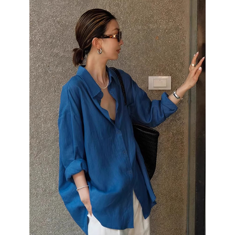 High-quality linen sunscreen long-sleeved shirt loose versatile cardigan jacket thin loose cotton linen blue shirt