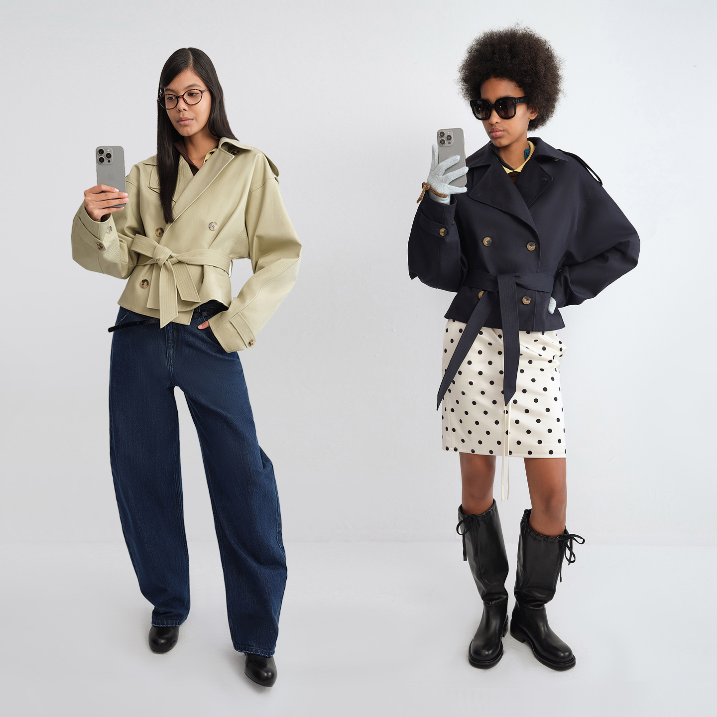 RARELY ALIKE Double-breasted cropped trench coat jacket Light khaki/navy blue
