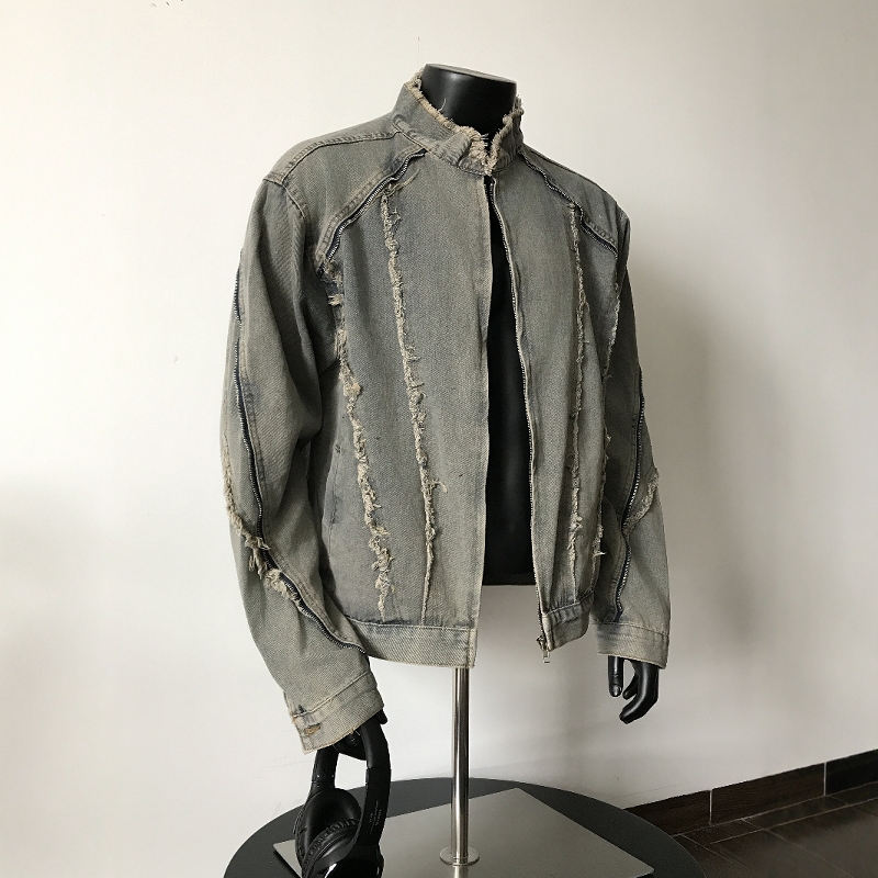 2025 American retro deconstruction raw edge denim jacket men's spring and autumn street washed short stand-up collar jacket trend