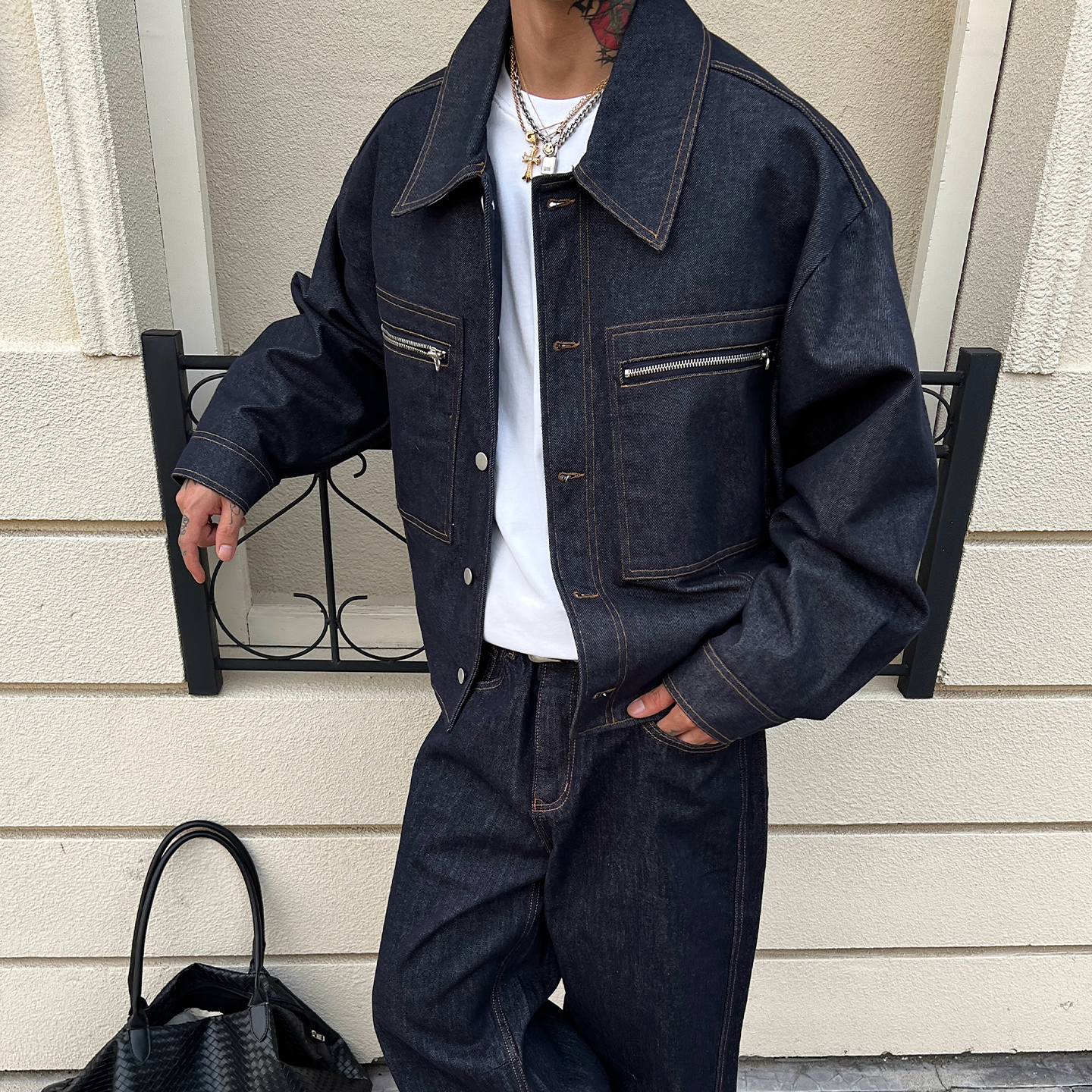OXFREAK "denim color raw cow high-end" distressed vintage denim jacket men's loose double pocket jacket