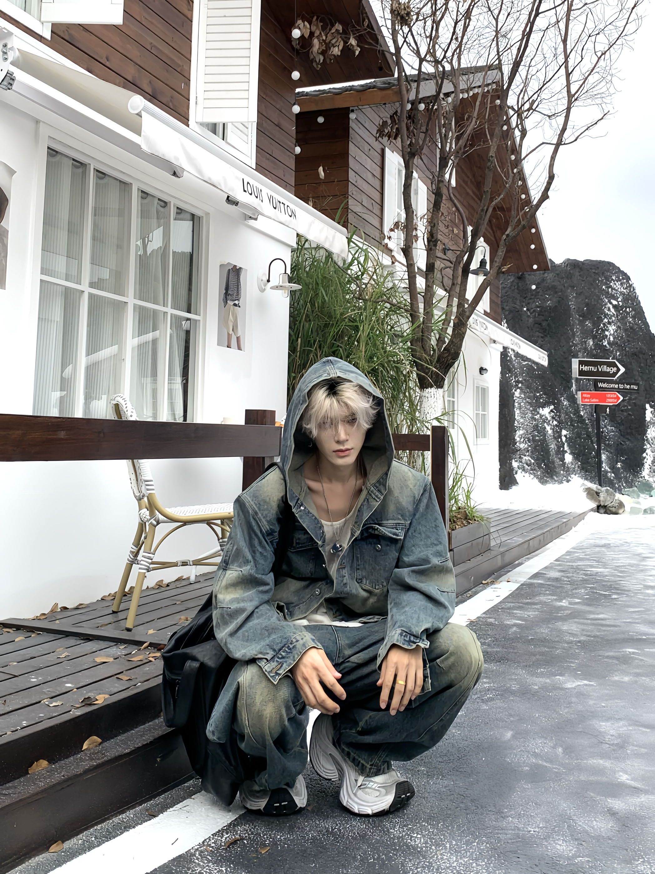 CulturE niche heavy industry deconstructs old shoulder pads hooded denim jacket set metal embellished jeans men
